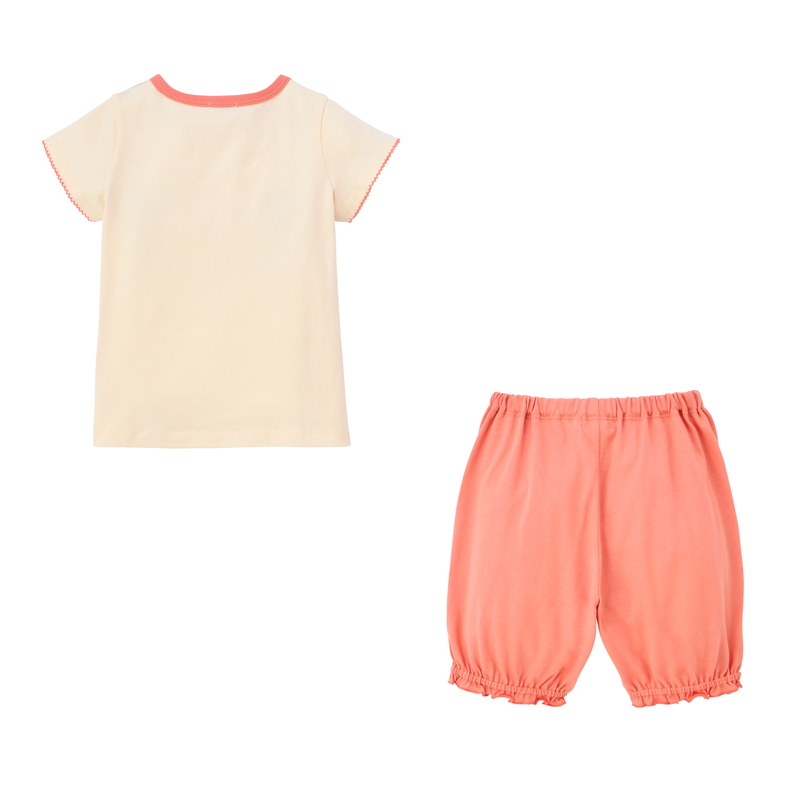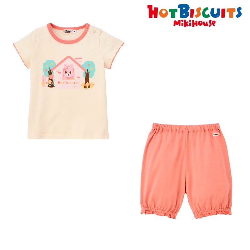 ミキハウス ホットビスケッツの半袖Tシャツと6分丈パンツのセットです。 ホットビスケッツらしいキャビットのデザインとくすみカラーは 単品でも使いやすく、デイリーユースにもおすすめです。 パンツの裾がメロウ仕上げになっているので、かわいらしい雰囲気になっています。 丈夫なバインダーネックで首元がよれにくく、 お洗濯を繰り返しても型崩れが少ない仕様です。 [素材感] さらっとした肌触りで通気性がよく、汗をしっかりと吸収し 洗濯しても傷みにくく型崩れしにくい丈夫な天竺素材。 [スタイリング] 同じシリーズのビーンズのセット(74-1105-145)とのリンクコーデもできます。 ●綿100% ●半袖 ●6分丈 ●肩開き仕様