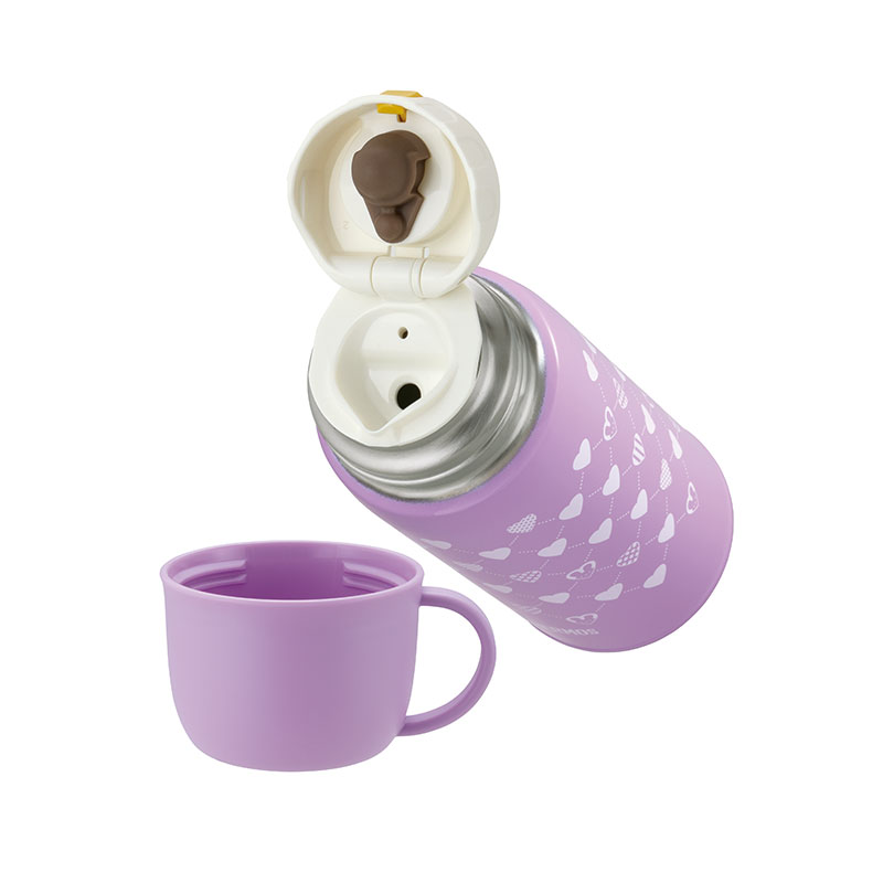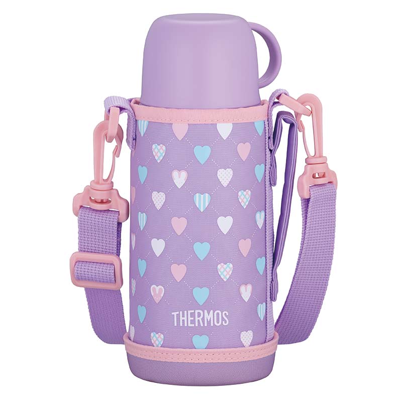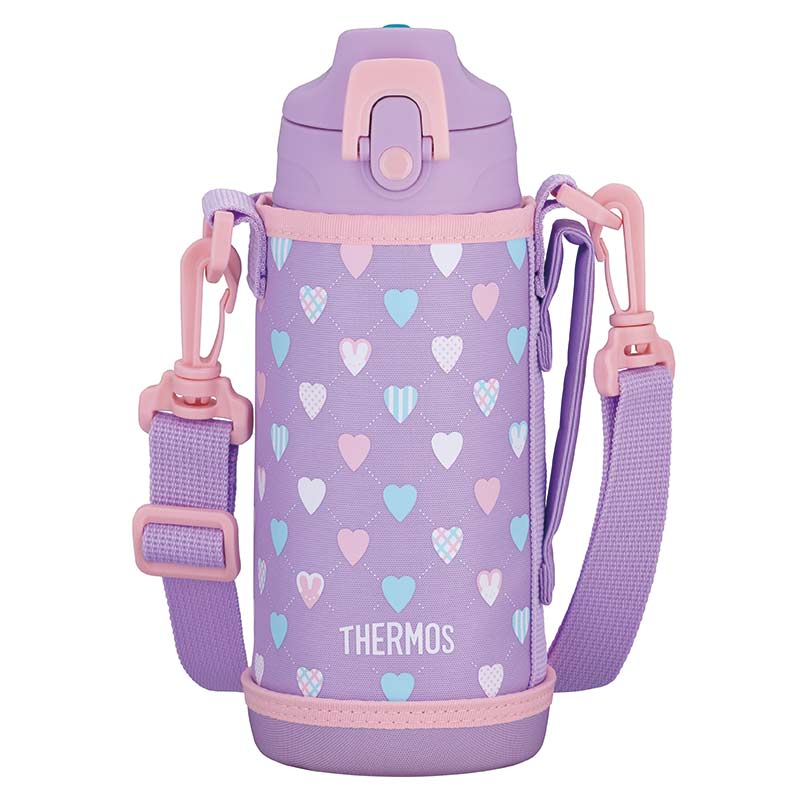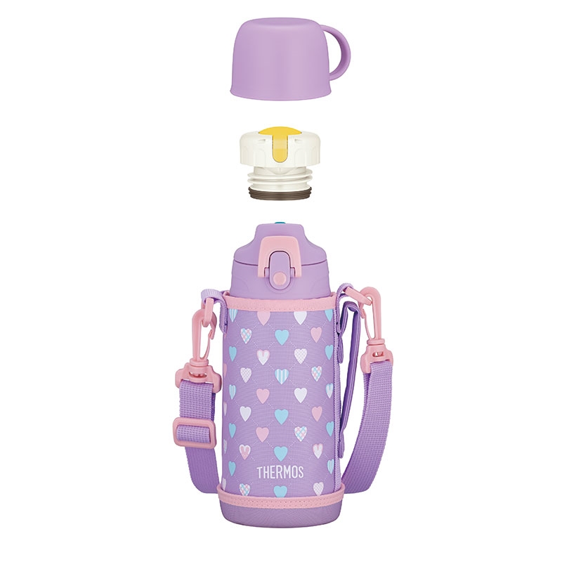 保冷専用のスポーツタイプと、保温・保冷両用のコップ付きタイプの2ウェイボトル 小さなお子様に使っていただきやすいボトルです。 飲みやすい構造の飲み口で、飲み口をくわえるお子様でもごくごく飲める仕様です。 ストラップ付のハンディポーチには、肩にやさしいショルダーパッドもついています。