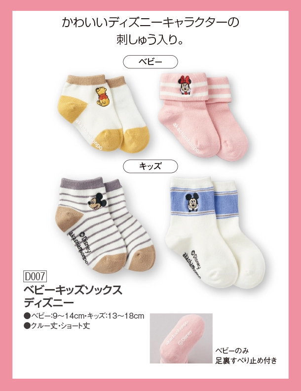 赤ちゃんの足に可愛い、アンクル丈の滑り止め付きディズニーショートソックスです。 足の甲部分に、ミッキーとプーさんのワンポイント刺繍が施されているのがポイントです。 足サイズは9~14cmの1サイズで、 ブルーボーダーのミッキー柄と、イエローベージュ系のプーさん柄の2色展開になります。