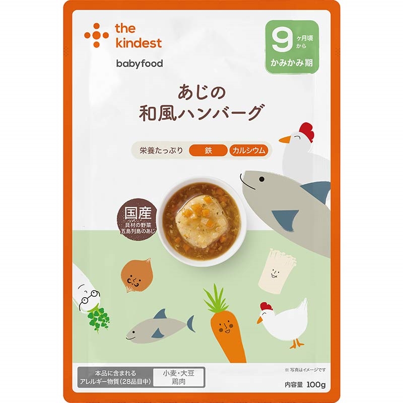 五島列島産のあじを使用した、やわらかくて食べやすいお魚のハンバーグです。 かつお出汁のやさしい風味に少量のしょうががアクセントになった、ごはんと合わせやすい和食の定番おかずです。 離乳食後期におすすめです。