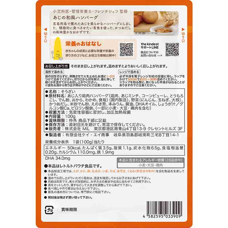 ●そうざい ●原材料名:あじ入り鶏肉ハンバーグ(鶏肉、あじミンチ、コーンピューレ、とうもろこし、でん粉、おから、わかめ、食塩)(国内製造)、野菜(にんじん、玉ねぎ、大根)、かつおだし、米粉でん粉、えのき茸、本みりん、醤油、DHAオイル、しょうが汁/グルコン酸Ca、ピロリン酸鉄、(一部に小麦・大豆・鶏肉を含む) ●内容量:100g ●栄養成分:100g当たり 熱量 50kcal たんぱく質 3.5g 脂質 1.1g 炭水化物 6.5g ナトリウム mg カルシウム 110mg 鉄 1.9mg