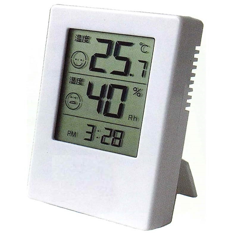 デジタル時計付きの小型温湿度計です。 温度3段階、湿度3段階の計6種のアイコンがお部屋の状態をお知らせします。 卓上や壁掛け、裏面にマグネットがついているのでスチール面にも設置できます。 電池残量表示で電池交換のタイミングがわかります。