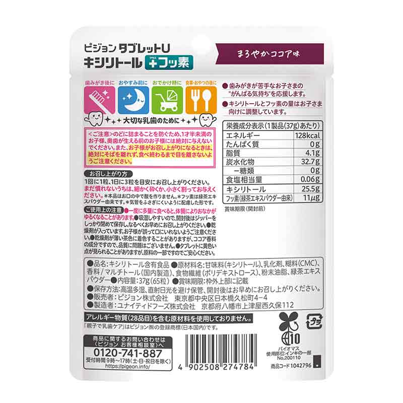 歯みがき後に・おやすみ前に・おでかけ時に・食事・おやつの後に、大切な乳歯のために イヤイヤ歯みがきのごほうびに タブレットU キシリトール+フッ素の特長 ●毎日の歯みがき習慣は、お子さまの将来の歯の健康にとって、とても大切です。 歯みがきが苦手なお子さまのがんばる気持ちを応援します。 ●お口の中で酸を作らないキシリトール。 ●緑茶エキスパウダー由来のフッ素を配合。 ●キシリトールとフッ素の量はお子さま向けに調整しています。 ●アレルゲン不使用・シュガーレス。 ●気管をふさぎにくいように配慮した形です。 お召し上がり方 1回に1粒、1日に3粒を目安にお召し上がりください。 まだ慣れないうちは、細かく砕くか、小さく割ってお与えください。 *本品はお口の中で酸を作りません。 *フッ素は緑茶エキスパウダー由来です。 *気管をふさぎにくいように配慮した形です。