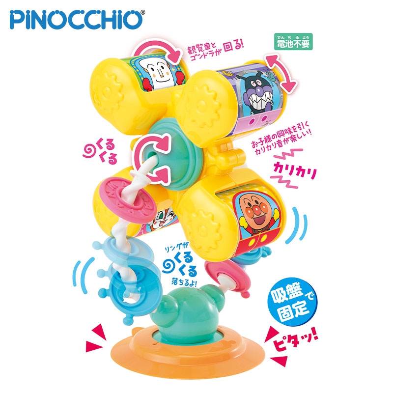 吸盤がおもちゃをテーブルにピタッと固定してくれるので、集中して遊べます。 テーブルデビューのお子様にぴったりのおもちゃです。 観覧車がカリカリ音とともに周り、ドラムの絵柄がくるくる変わります。 かわいいリングが4つ、らせん状のアームをくるくるまわりながら降りてきます。 赤ちゃんの手指の発達を促す手遊び付きの観覧車です。