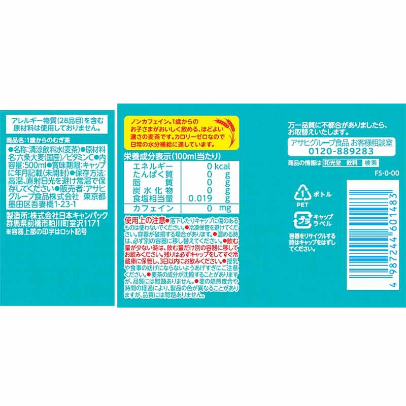 ●原材料:六条大麦(国産)/ビタミンC ●内容量:500ml ●栄養成分:100ml当たり エネルギー:0kcal、たんぱく質:0g、脂質:0g、炭水化物:0g、食塩相当量:0.019g ●使用開始月齢:1歳からずっと