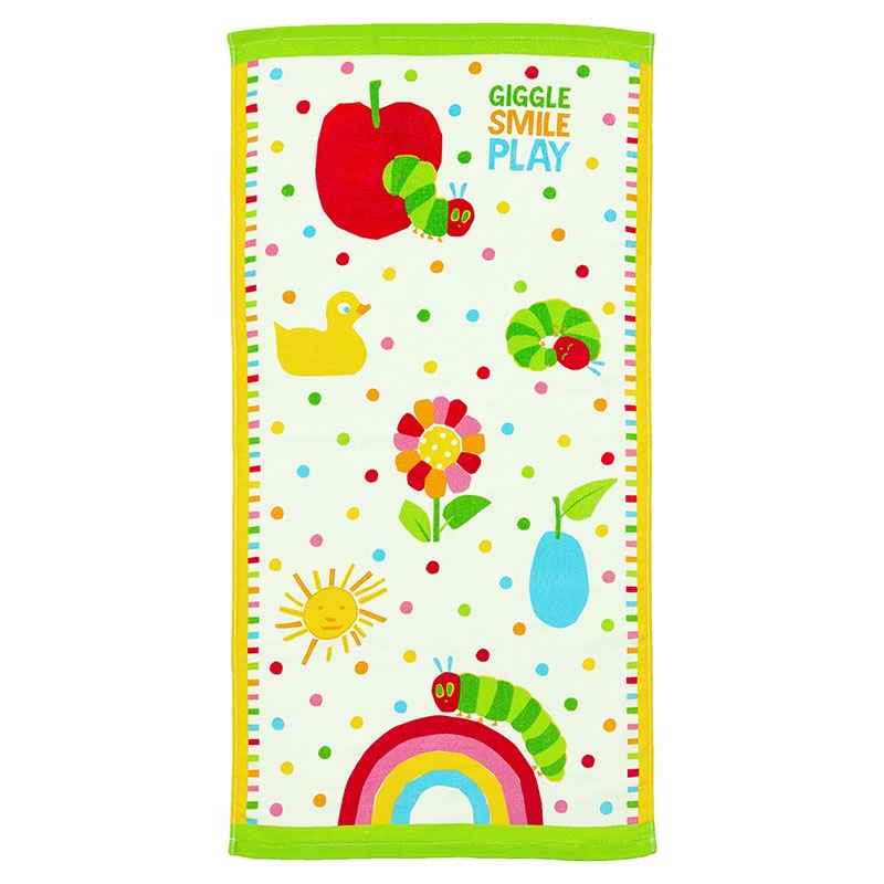 ●素材:綿100% ●サイズ:約60×120cm ※お洗濯についての注意 商品の特性上、洗濯時に色落ちや毛羽落ちしますので他のものと別にお洗い下さい。 また、洗濯ネットの使用をおすすめします。 ・色・柄ものは長時間汗や水に濡れたり、浸けたままにしますと 他のものに色移りしますので、ご注意下さい。 ・塩素系漂白剤は色落ち、変色しますので、使用しないで下さい。 ・柔軟剤をご使用になりますと吸水性が悪くなり、 パイル糸が抜けやすく、毛羽落ちしやすくなります。 ・パイル糸が引き抜けた場合は、ひっぱらずにその部分をハサミでカットして下さい。 TM & (C) 2025 Eric Carle LLC.