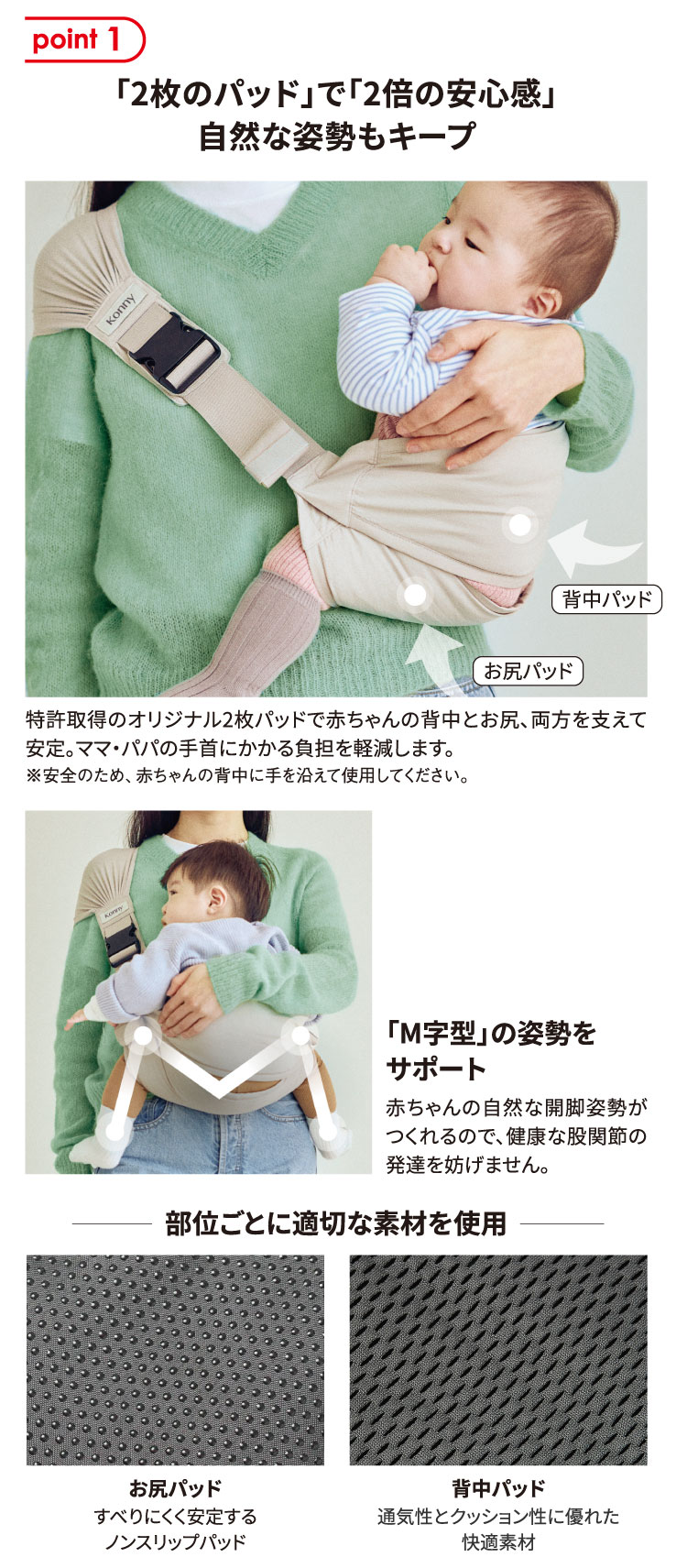 ●対象年齢:ひとり座りできる時期から体重20kgまで ●素材: [表地]綿60%・ナイロン40% [背中パッド]ポリエステル100%(3Dメッシュ) [お尻パッド]ポリエステル100% [肩紐]ポリエステル62%・綿33%・ポリウレタン5% [滑り止め]シリコーン