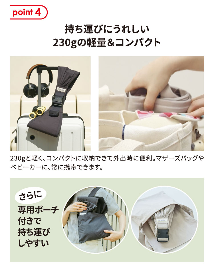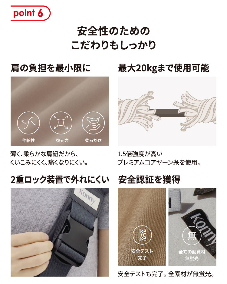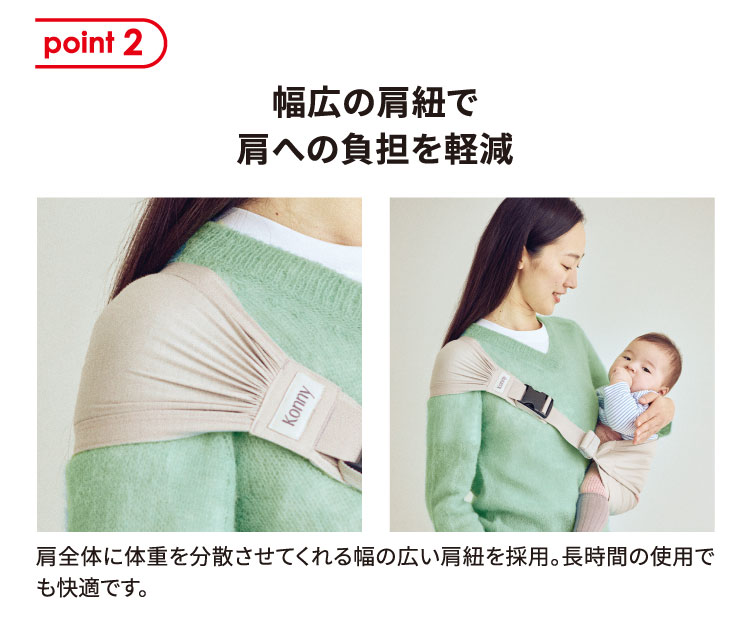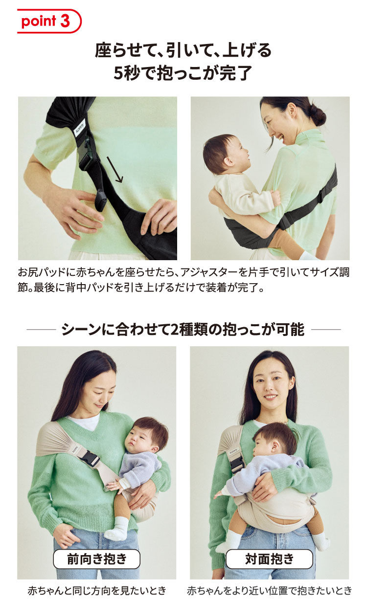 一人座りができ手を伸ばしていろんなものに関心を持つ頃、 新しい世界を体験させてください。 コニーヒップシートでより軽く、より簡単にたくさん抱っこしてあげましょう。 赤ちゃんはママパパに抱かれて新たな経験を積み重ねていくのでしょう。 さあ、赤ちゃんと一緒に歩いてみましょう! \コニーヒップシートはこんな時に便利/ ・”抱っこして、おろして”を繰り返す時 ・一般の抱っこ紐では窮屈で素手で抱くのはむつかしい時 ・保育園、お買い物、病院など簡単なお出かけの時 ・ベビーカーでの外出に持ち運びできる抱っこ紐が必要な時 ・ピクニック、両行など屋外活動が多い時