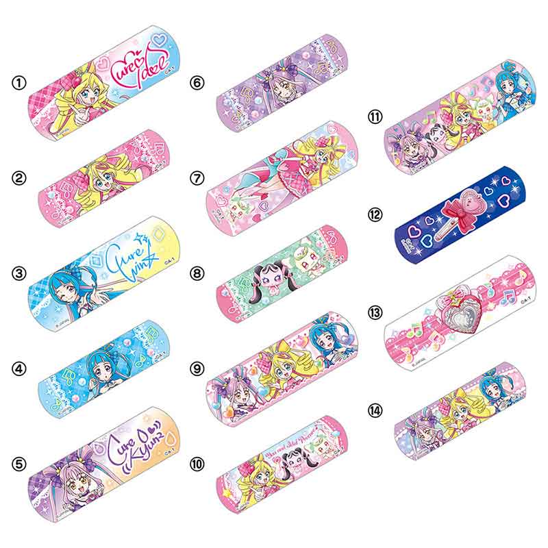 キミとアイドルプリキュアのばんそうこうです。 ジュニアサイズのばんそうこう9枚ミニサイズばんそうこう9枚合計18枚入りです。 絵柄は全部で14種類あります。 14種類全て揃わない場合があります。 はがすときにやさしいソフトな粘着力です。 傷つきにくい加工パッドとなっております。 通気性を高める微細な穴加工テープです。 (c)ABC-A・東映アニメーション