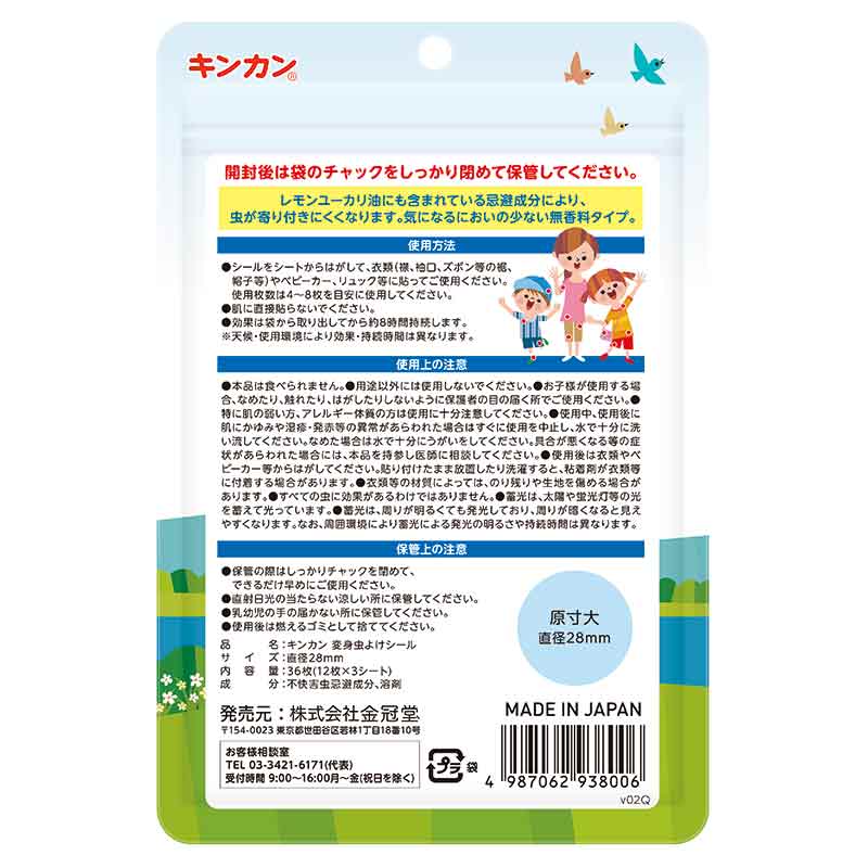 ●対象月齢:0ヵ月~ ●形状: 円形シール(直径28mm) ●容量: 36枚(12枚×3シート) ●成分:不快害虫忌避成分、溶剤 ●使用方法: ・シールをシートからはがして、衣類(襟、袖口、ズボン等の裾、帽子等)やベビーカー、リュック等に貼ってご使用ください。 ※使用枚数は4~8枚を目安に使用してください。 ・肌に直接貼らないでください。 ・効果は袋から取り出してから約8時間持続します。 ※天候・使用環境により効果・持続時間は異なります。