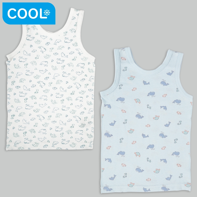 前後どちらでも着られる、お着替えスムーズな肌着。 素材は綿100%のメッシュ生地なので、汗をしっかり吸収し拡散、乾燥させ、 通気性がよく、汗をかいてもサラサラ快適に過ごせます。 外縫い仕様で、洗濯ネームも外についていて、 肌に直接あたりにくく安心して着ることができる、 夏の暑い季節に最適で、洗い替えに便利な2枚組になってます。