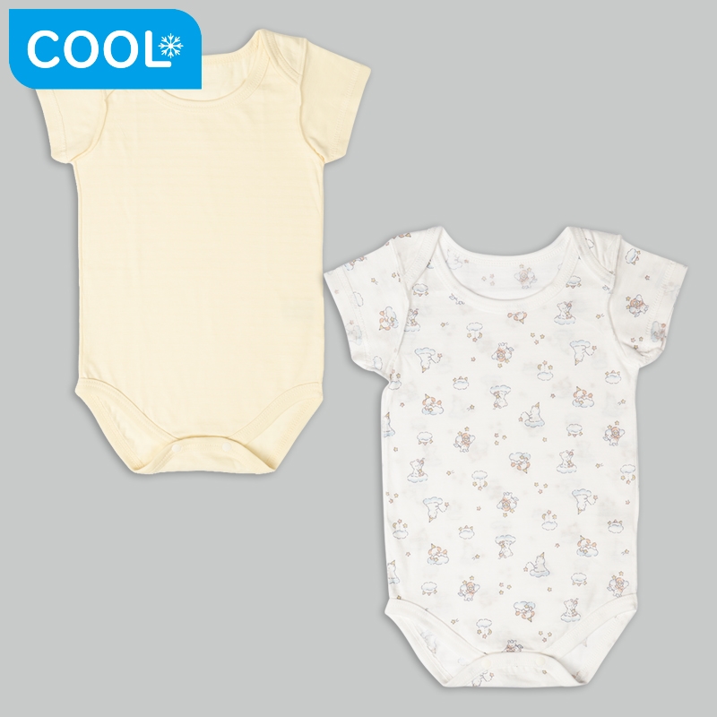 触るとひんやりと感じる生地です。汗をかいても乾きやすい 吸水速乾機能もついているので、さらりと快適に過ごせます。 肌触りもやわらかく、とてもなめらかな綿100%素材です。 股ボタン開閉でおむつ替えもカンタンです。 夏の暑い季節に最適で、洗い替えに便利な2枚組になってます。