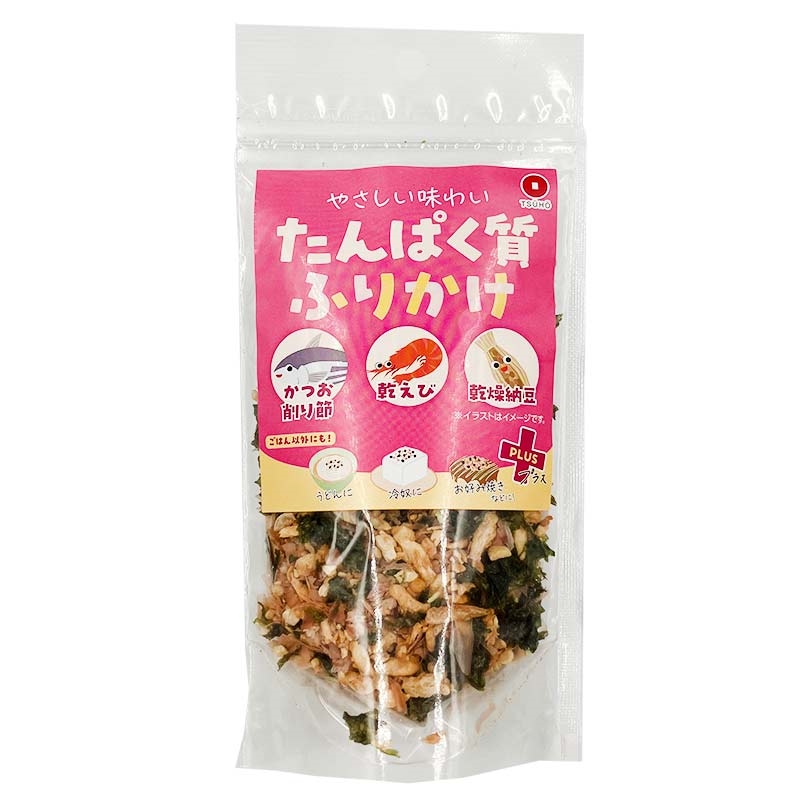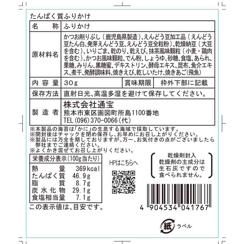 ●ふりかけ ●原材料名:かつお削りぶし(鹿児島県製造)、えんどう豆加工品(えんどう豆たん白、発芽えんどう豆、えんどう豆全粒粉)、乾燥納豆(大豆を含む)、いりごま、乾のり、乾えび、抹茶風味顆粒(小麦・鶏肉を含む)、かつお風味顆粒、でん粉、しょうゆ、砂糖、食塩、あられ、果糖、みりん、黒糖蜜、デキストリン、酵母エキス、昆布、魚介エキス、煮干、発酵調味料、焼きえび、乾しいたけ、焼きあご(飛魚) ●内容量:30g ●栄養成分:100g当たり 熱量 369kcal たんぱく質 46.9g 脂質 8.7g 炭水化物 29.1g ナトリウム -mg 食塩相当量 7.1g