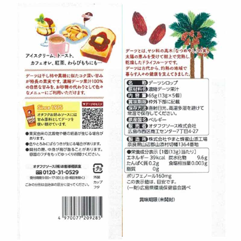 ●デーツシロップ ●原材料名:濃縮デーツ果汁 ●内容量:65g(13g×5個) ●栄養成分:その他 熱量 39kcal たんぱく質 0.2g 脂質 0g 炭水化物 9.6g 食塩相当量 0.003g ポリフェノール 160mg