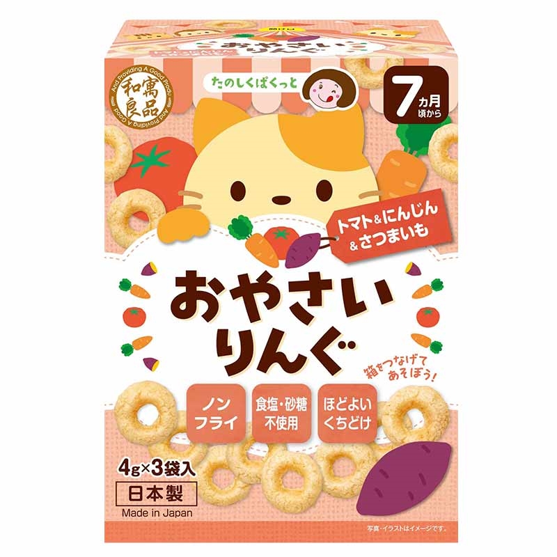 食塩、砂糖不使用の商品です。 軽いさくさく食感で、程よいくちどけのお菓子で、赤ちゃんが握りやすいリング型になっており、持ち運びにも便利な個包装タイプです。 トマト、にんじん、さつまいものパウダーが練り込まれているので、ほんのりおやさいの風味がします。