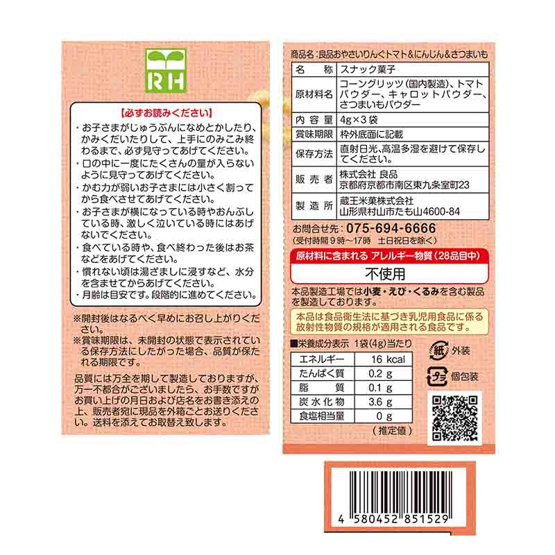 ●スナック菓子 ●原材料名:コーングリッツ(国内製造)、トマトパウダー、キャロットパウダー、さつまいもパウダー ●内容量:4g×3袋 ●栄養成分:その他 熱量 16kcal たんぱく質 0.2g 脂質 0.1g 炭水化物 3.6g 食塩相当量 0g
