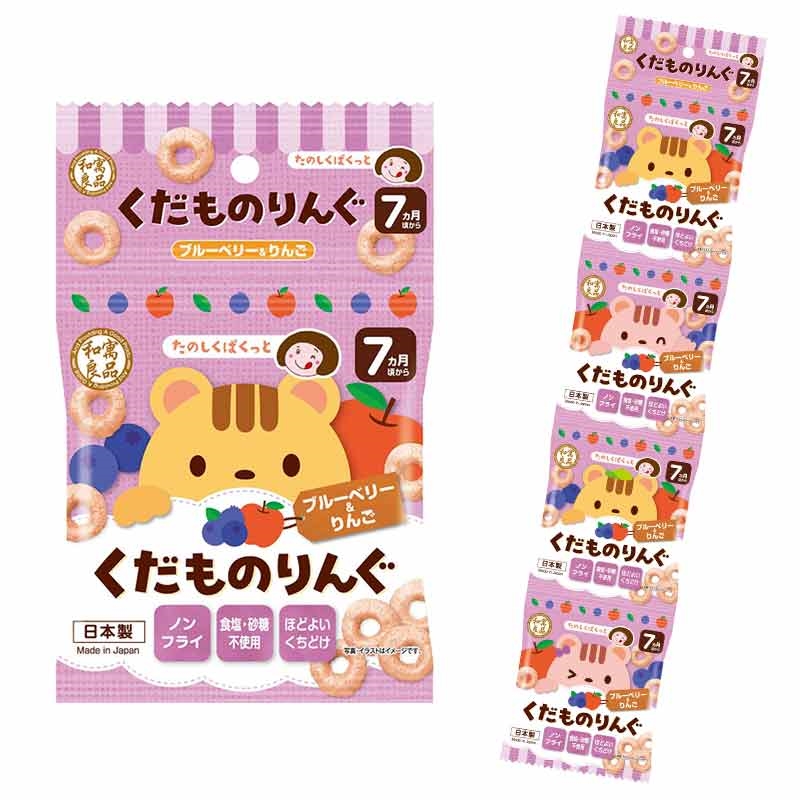 食塩、砂糖不使用の商品です。 軽いさくさく食感で、程よいくちどけのパフスナックです。 赤ちゃんが握りやすいリング型になっており、ブルーベリーパウダー、りんごパウダーが練り込まれており、ほんのりくだものの風味がします。