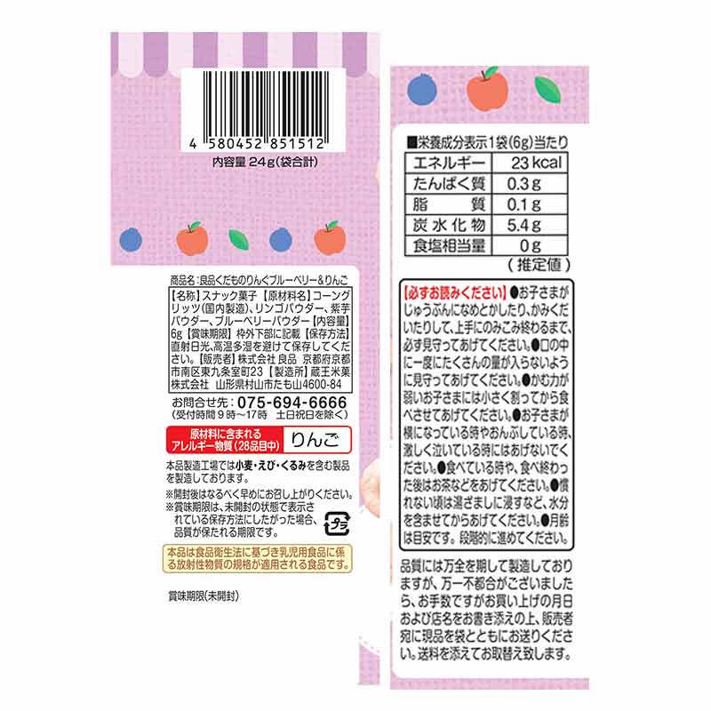 ●スナック菓子 ●原材料名:コーングリッツ(国内製造)、リンゴパウダー、紫芋パウダー、ブルーベリーパウダー ●内容量:6g ●栄養成分:1袋当たり 熱量 23kcal たんぱく質 0.3g 脂質 0.1g 炭水化物 5.4g 食塩相当量 0g