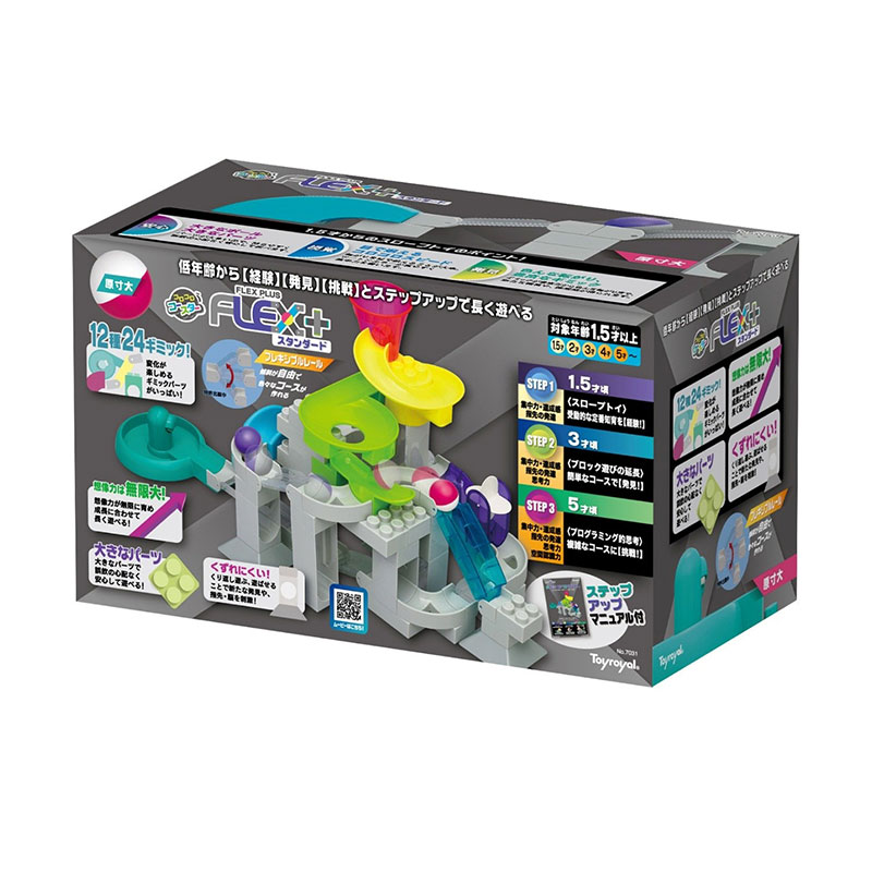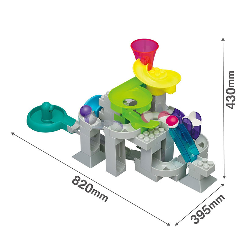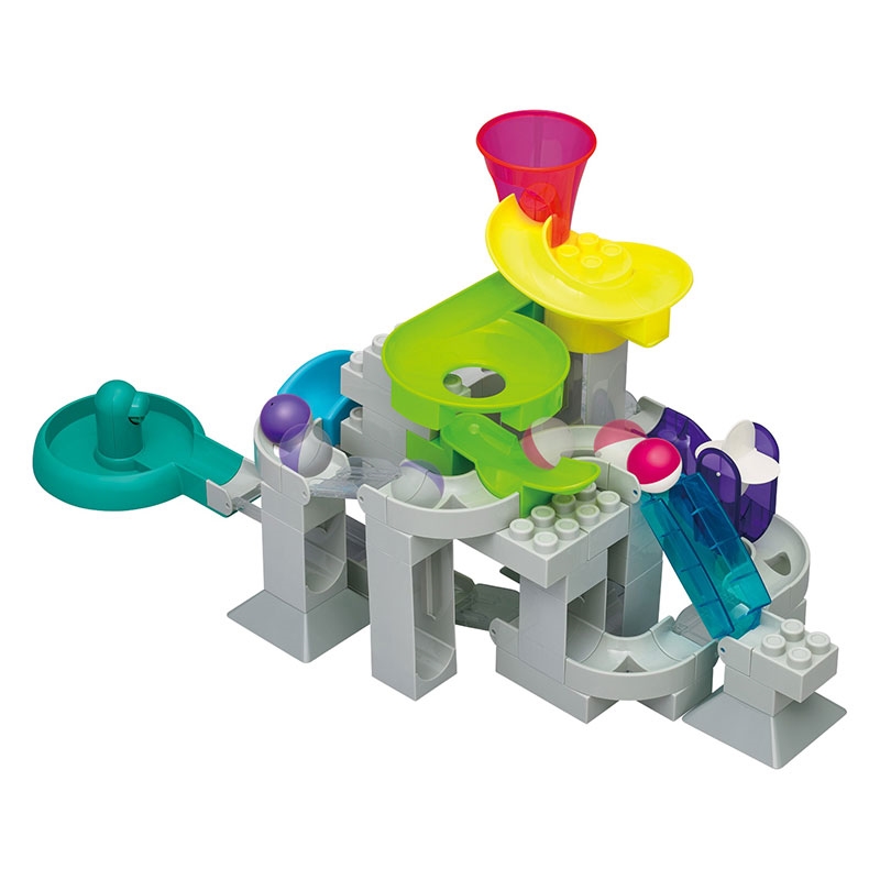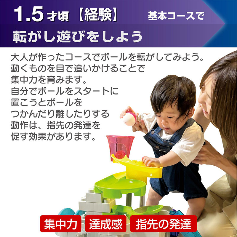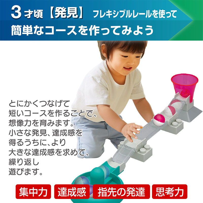 低年齢からステップアップして長く遊べる。 ブロックあそびからスロープトイとして。 経験、発見、挑戦と年齢に合わせて遊べる。 基本コース作成でころがし遊びから、 多種にわたるギミックを使ってコースを作ってころがしてみる。 考える、作る、ころがすを繰り返し思考力、空間認識力、集中力を育みます。