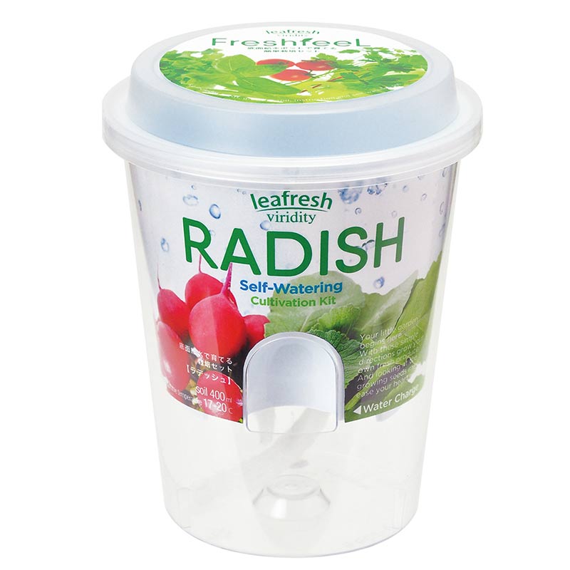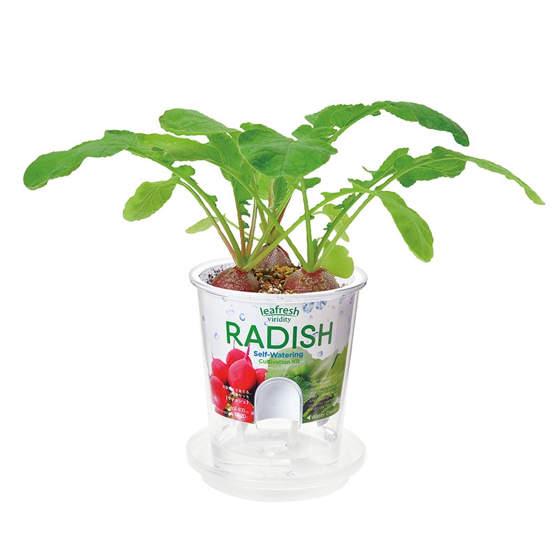 底面給水栽培セットは側面に注水口があり、インナーポットを持ち上げなくても底から直接水をあげることができるので水の管理が簡単です。 透明なポットは水やりのタイミングも一目で分かるため、機能的に使うことができます。 収穫はラディッシュの頭が丸くなって顔を出したら収穫どきです。 この栽培セットのラディッシュはサラダの彩りにぴったり。 輪切りにしてリーフレタスのサラダに乗せるだけで彩りが綺麗に映えます。