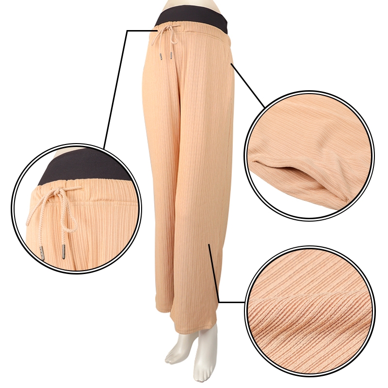 すっきりとしたきれいなワイドライン。 伸縮性に優れ、縦目に凹凸感があり、スッキリと見えます。 ストレッチ性のある素材で、ストレスフリーな履き心地。 左右ポケット付き。 ウエスト調節ひも付き。 産前産後ながく着用頂けます。