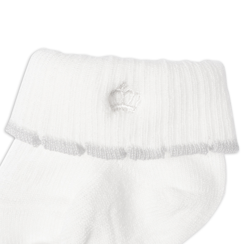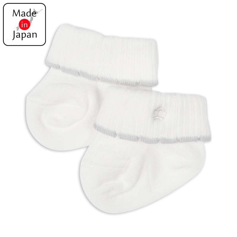 退院時やお宮参り、お披露目会などのセレモニーにもご使用いただける、国産新生児用のくつしたです。 折り返し部分にクラウン刺繍を施し、グレーのピコがついている上品で可愛らしいデザインが特徴です。 シンプルなデザインでどんな服装にも合わせやすいです。