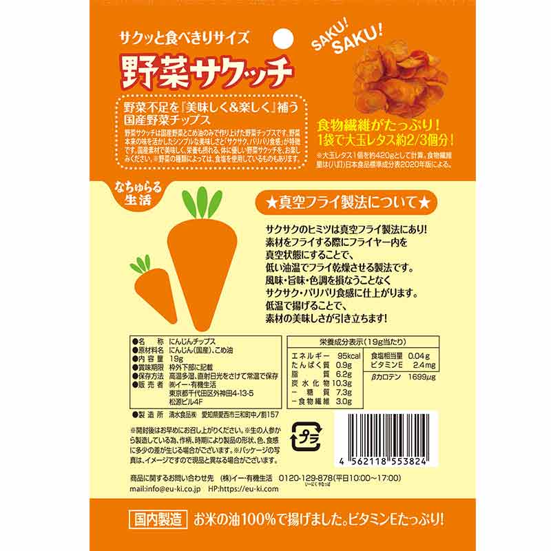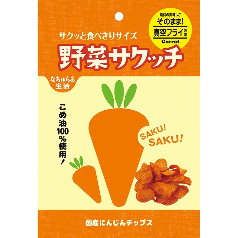 野菜不足を美味しく&楽しく補う国産野菜チップスというコンセプトで開発しました。 国産の人参をスライスし、消泡剤不使用のこめ油を使用し、真空フライヤーで揚げ、チップスにしました。 人参の甘さとサクサクした食感が特徴です。 人参の甘さが引き立っているのであえて味付けをしておりません。 強調表示できる栄養素が多数検出されており、パッケージに記載したり、ホームページでも公開しております。 購入して頂いたお客様に、味だけでなく商品の品質も納得して頂けるようになっております。