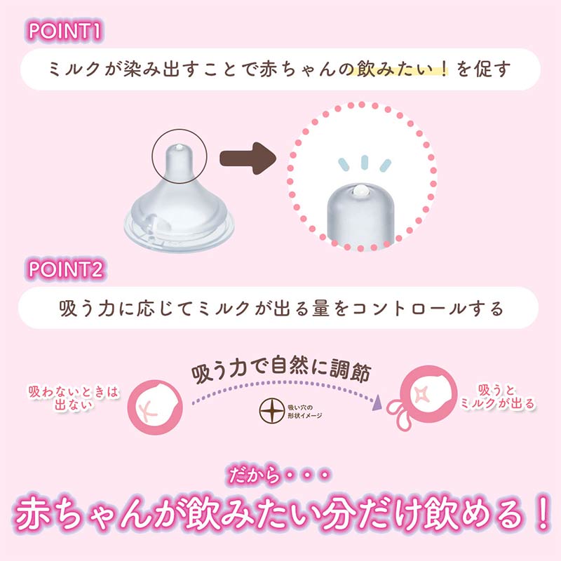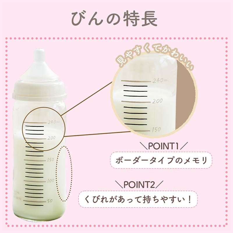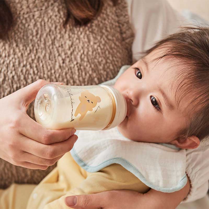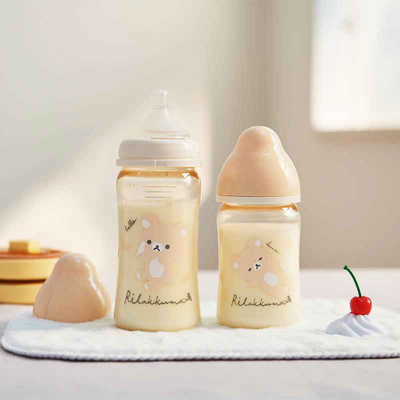 ●かわいいリラックマデザイン ●全パーツ日本製 ●おっぱい研究から生まれた新設計 ●新生児から卒乳まで全月齢対応のマルチフィット乳首(特許出願中)付き ●ワイドな広口タイプで調乳もラクラク ●軽くて割れにくいプラスチック製 ●内分泌かく乱化学物質をふくまない素材PPSU(ポリフェニルサルホン)採用 ●煮沸・薬液・電子レンジ消毒ができます (c)SAN-X CO., LTD.