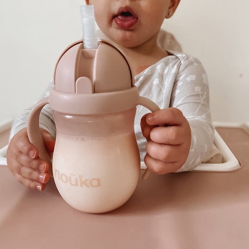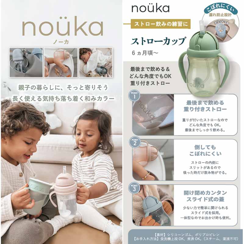 カナダ発のブランド、nouka(ノーカ)が目指すのは、赤ちゃんにも親にも心地よい毎日。 シンプルで洗練されたデザインのマグは、成長をやさしくサポートしながら、おうちでも外出先でも活躍する実用性が魅力です。 忙しい育児の中に、少しの余裕と楽しさを。 noukaのマグが、親子の暮らしをもっと豊かにします。 離乳食が進み、吸う力が発達してきたら。 手で支える動作の練習としても良いタイミング。 最後まで飲める、どんな角度でも飲める重り付きストロー。