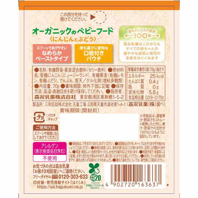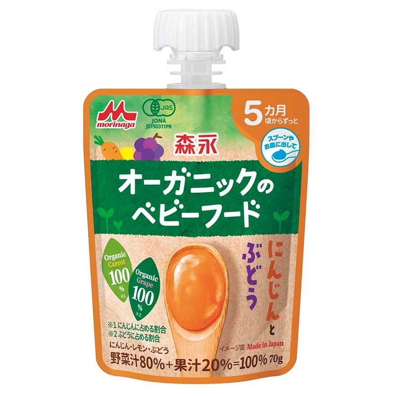 素材本来のおいしさにこだわった、有機JAS認証を取得したベビーフードです。 離乳食をはじめる5ヵ月頃から食べられます。 持ち運びしやすいスパウト付きパウチを使用し、中身はスプーンであげやすいようになめらかなペースト状に仕上げているため、いつでもどこでもお子さまに食べさせられます。 にんじんとぶどうにレモンを加えて食べやすく仕上げました。