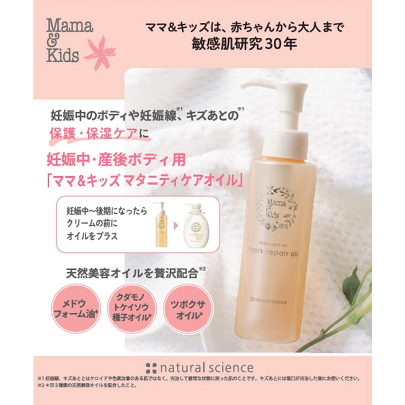 べたつきが少なく、肌に溶け込むようななめらかな敏感肌にも使える低刺激オイル。 角層まで浸透保湿し肌に弾力を与え、なめらかで柔軟な肌に導きます。 妊娠線※やキズあと※などのケア保湿としても。 ※ 妊娠線、キズあととはケロイドや色素沈着のある肌ではなく、完治して健常な状態に戻った肌のことです。 傷あとには傷口が完治した後にご使用ください。