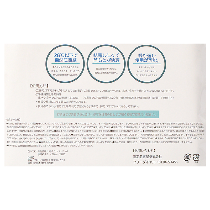 表材 TPU(熱可塑性ポリウレタン) 中材 PCM(特殊冷却物) サイズ 内側直径 約8.5cm 首回り 25cm~28cm(目安)