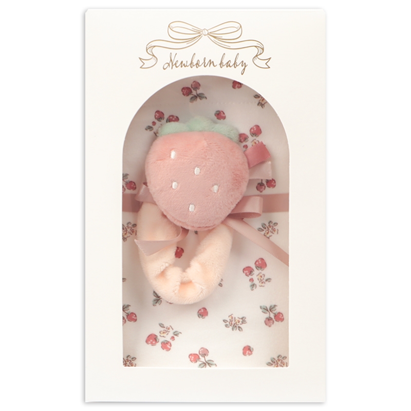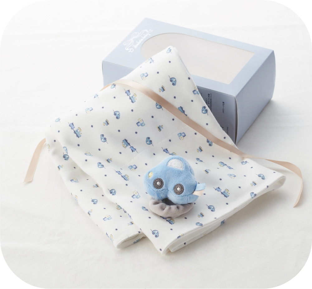 ご出産のお祝いにおすすめのギフトセットです。 やわらか素材のおくるみは、赤ちゃんを包んであげる事はもちろん、肌掛けとしてもお使いいただけます。 ご退院時のおくるみに、お昼寝に、色んなシーンにお使い頂ける便利なお品です。 おくるみの柄とおそろいのモチーフのリストラトルがセット。 リストラトルは赤ちゃんの手首や足首にはめてお使いいただけるので、 まだ上手に物を握れない低月齢の赤ちゃんにも遊んで頂けます。 中に鈴が入っており、振るとりんりん優しい音色がします。 タグが付いているので、さわったりつまんだり、指先を動かして遊べます。 おくるみとリストラトルをリボンで巻いて、箱に入れたパッケージでのお届けです。 ご出産お祝いのギフトとしてお渡し頂けます。 ※ラッピングはされてません。