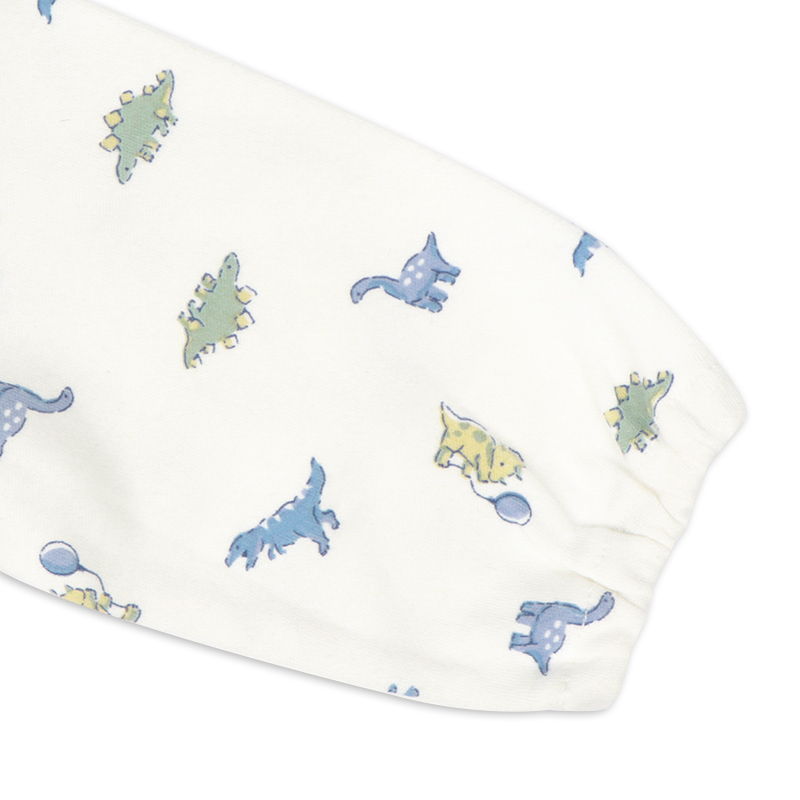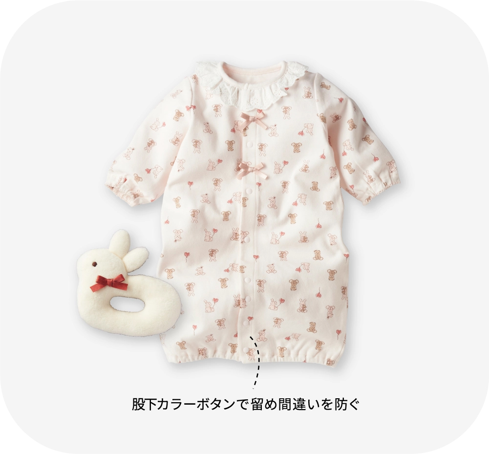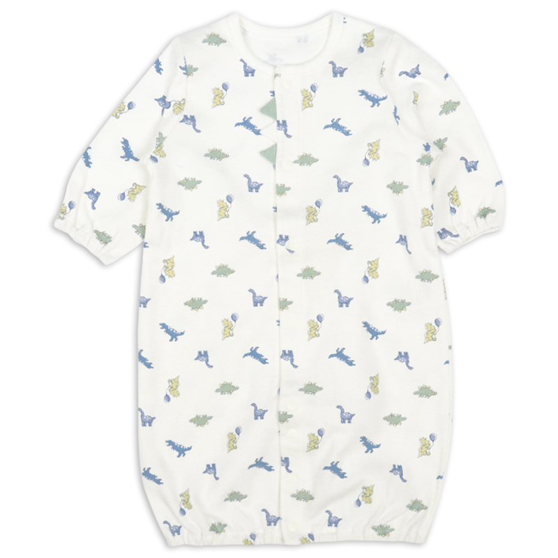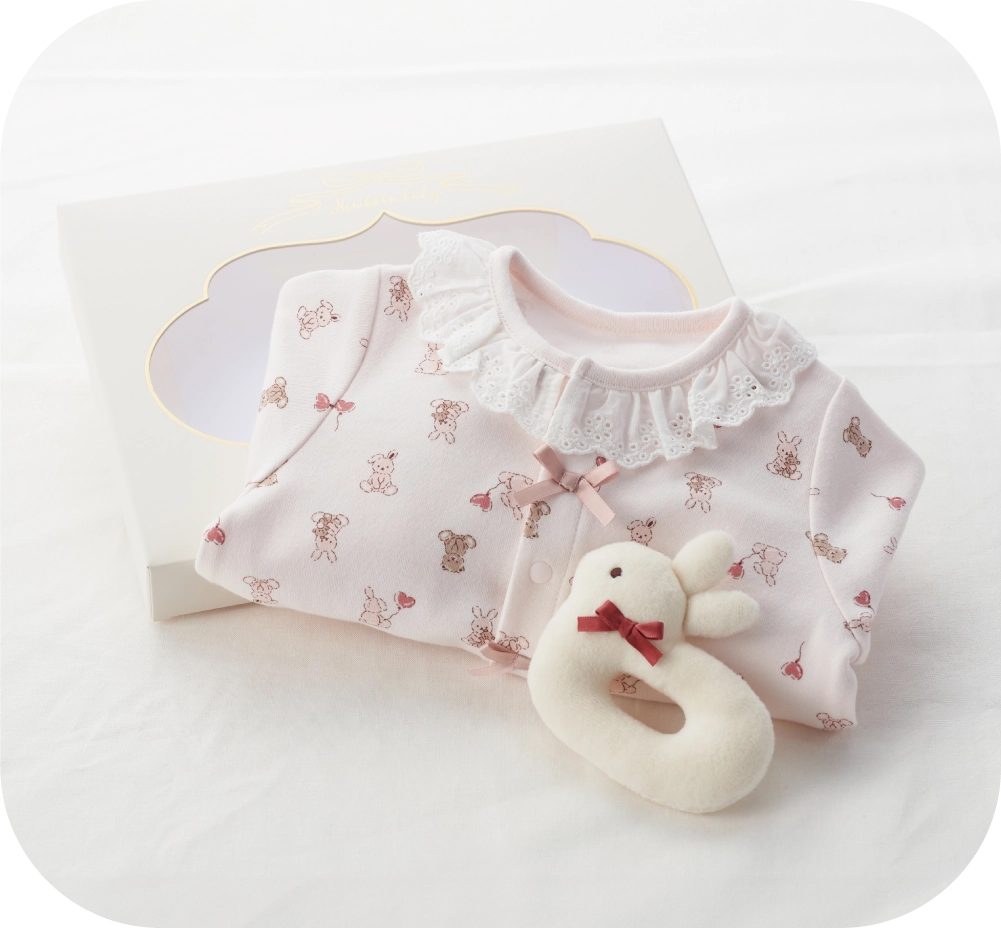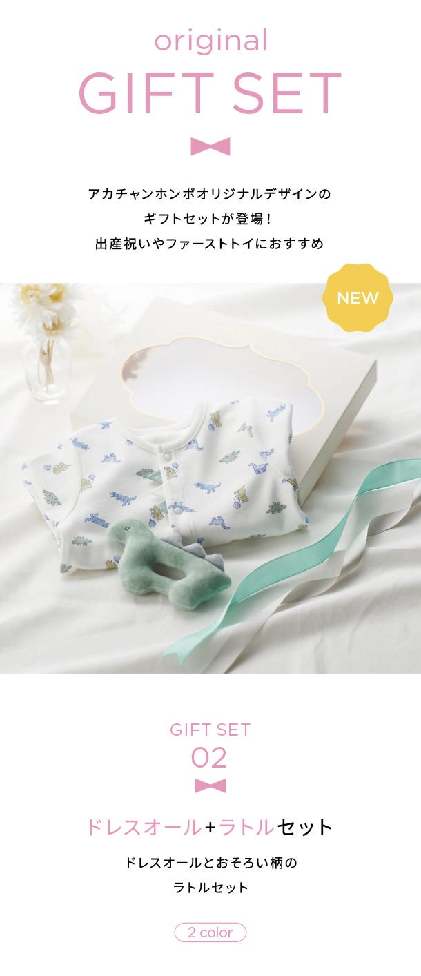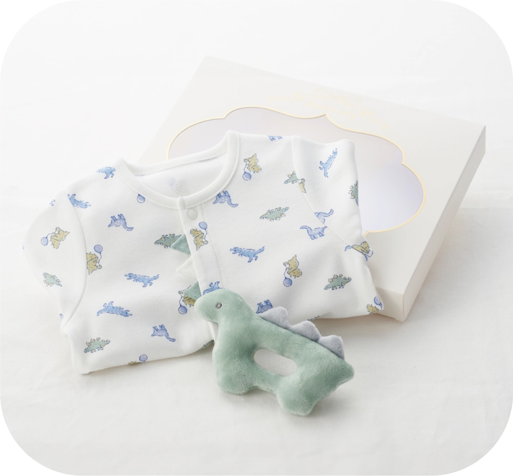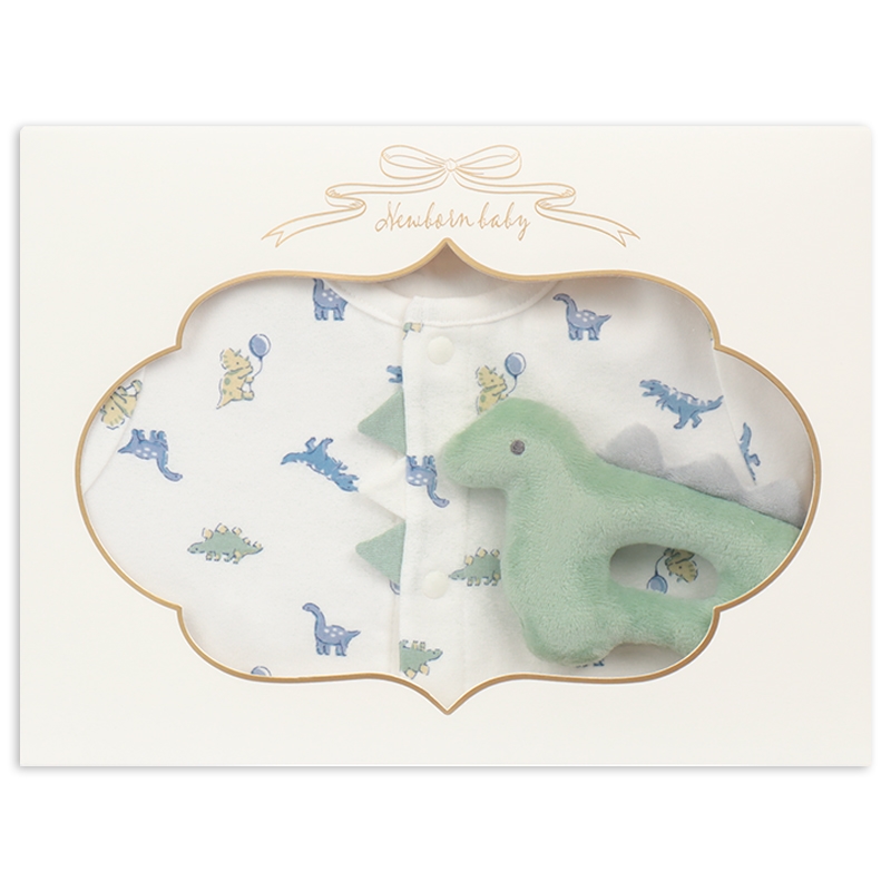 ご出産のお祝いにおすすめのギフトセットです。 やわらかな綿素材のドレスオールは便利な足元2WAY仕様。 うさぎ柄にはサテンリボンとレース襟、恐竜には恐竜の角のモチーフが胸元に付いた特別感のあるデザイン。 新生児の赤ちゃんに可愛く着せてあげられます。 ラトルは振るとリンリンやさしい音色がします。 月齢が小さいうちは振って赤ちゃんをあやしてあげたり、 自分で握れるようになったら振って遊んで頂けます。 箔プリント入りの高級感のある箱に入れたパッケージでのお届けです。 ご出産お祝いのギフトとしてお渡し頂けます。 ※ラッピングはされてません。