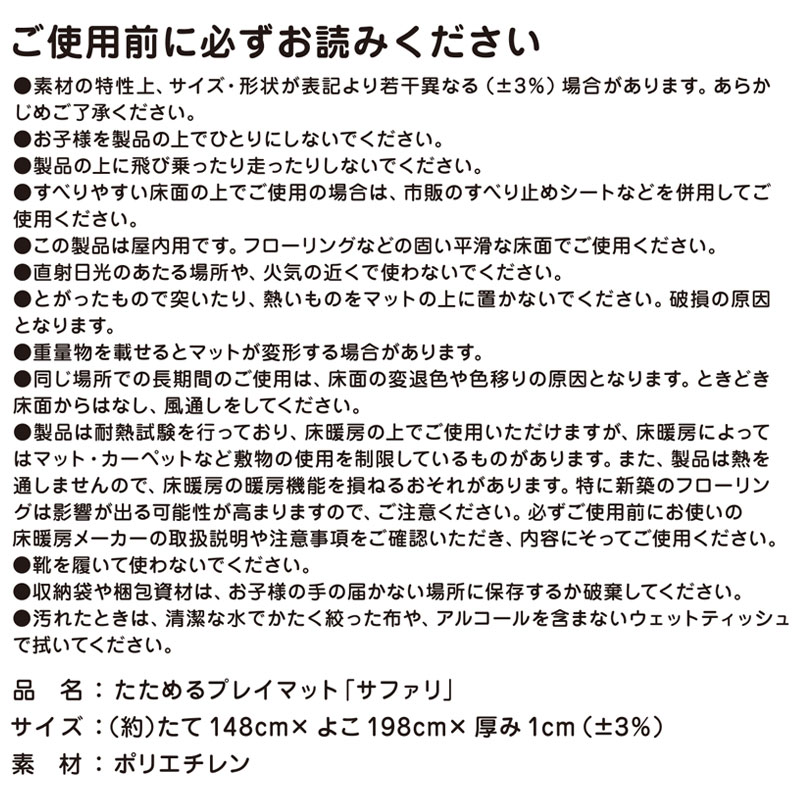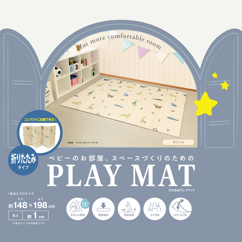 ・折りたたみが出来て小さくたためるプレイマット ・コンパクトに収納できます ・素材はポリエチレンを採用してますので ・水や汚れに強くなのでお手入れ簡単 ・クッション性がありキッズスペースにも使えます ・フローリングへのキズ防止にもなります