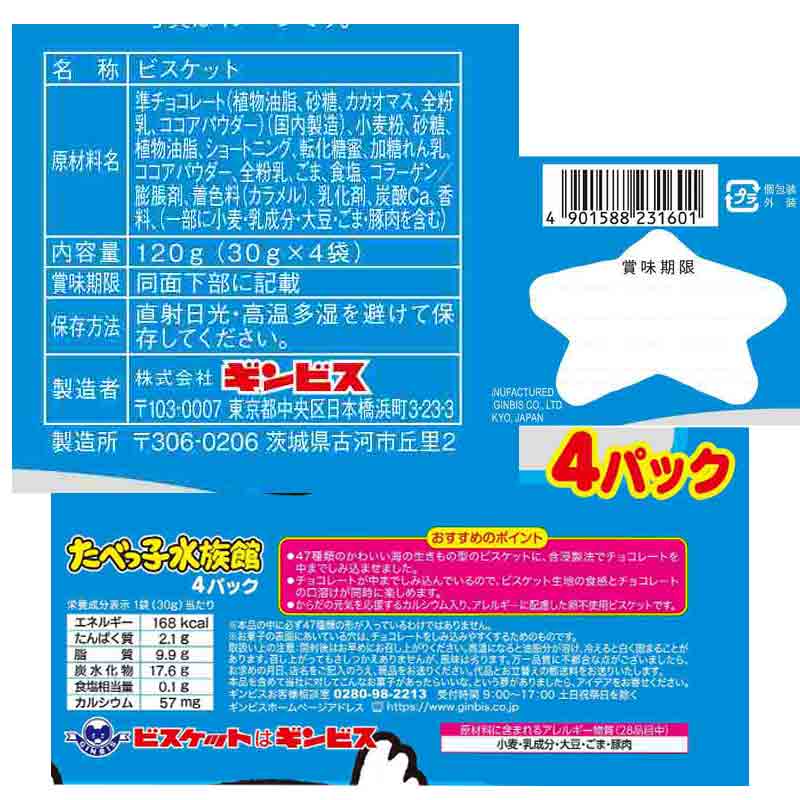 ●ビスケット ●原材料名:準チョコレート(植物油脂、砂糖、カカオマス、全粉乳、ココアパウダー)(国内製造)、小麦粉、砂糖、植物油脂、ショートニング、転化糖蜜、加糖れん乳、ココアパウダー、全粉乳、ごま、食塩、コラーゲン/膨脹剤、着色料(カラメル)、乳化剤、炭酸Ca、香料、(一部に小麦・乳成分・大豆・ごま・豚肉を含む) ●内容量:120g(30g×4袋) ●栄養成分:その他 熱量 168kcal たんぱく質 2.1g 脂質 9.9g 炭水化物 17.6g 食塩相当量 0.1g カルシウム 57mg