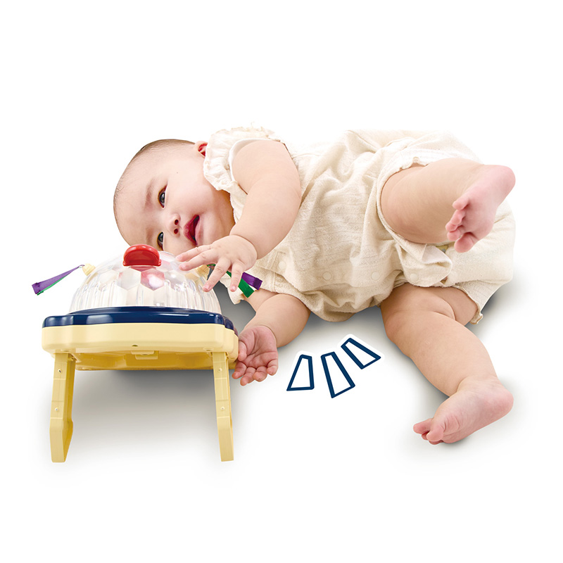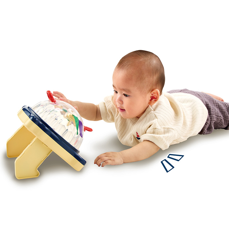 赤ちゃんが大好きなキラキラのミラーボール。 4か月の小さい力でも回せるから、 自分で触ったり回したりして能動的に遊べます。