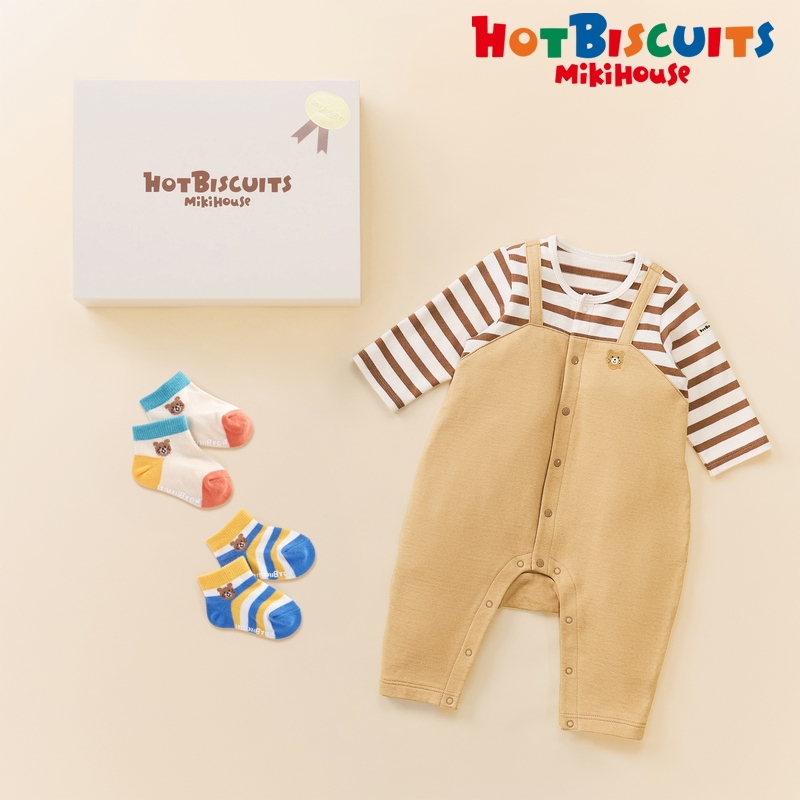 ミキハウス ホットビスケッツのベビーギフトセット。 春秋冬の3シーズン着ていただける重ね着風のカバーオールとソックスのセットです。 オーバーオールを着たようなデザインで、ユニセックスで着ていただけるやわらかなカバーオール。 寝返りをうったり、抱っこの機会が多かったりあんよ前のベビーにはつなぎのお洋服が安心。 重ね着が難しいベビーちゃん時期でも一枚で簡単にかわいくおしゃれを楽しめるセットです。 お箱に入っているので出産祝いなどのギフトにぴったり◎ 〈セット内容〉 ・カバーオール(70cm)【型番:70-1219-145】 ・ローカットソックス(11-13cm)【型番:74-9637-141】 ★★こちらの商品はギフトセットとなっておりますので、商品価格のわかるタグはついていません。プレゼントにおすすめです★★★