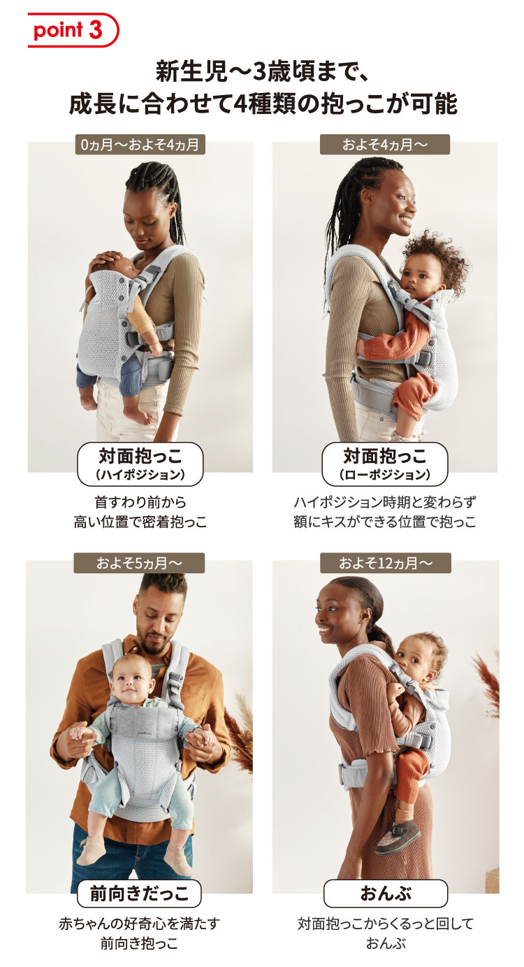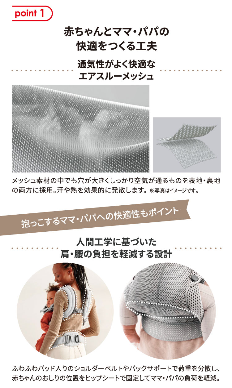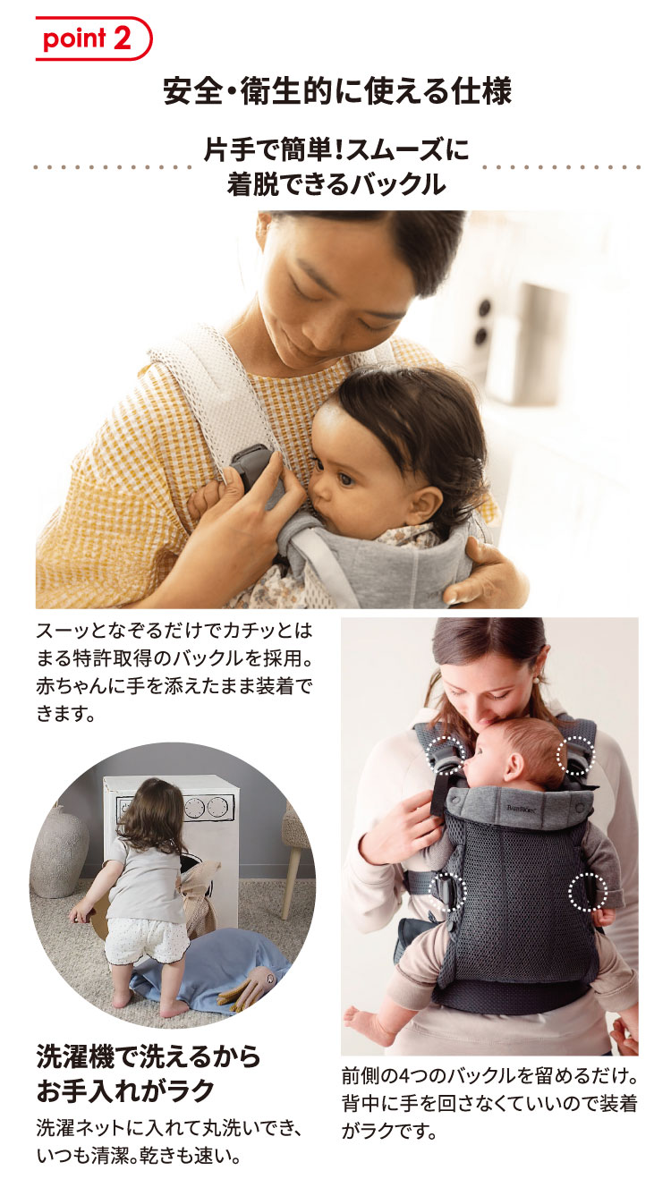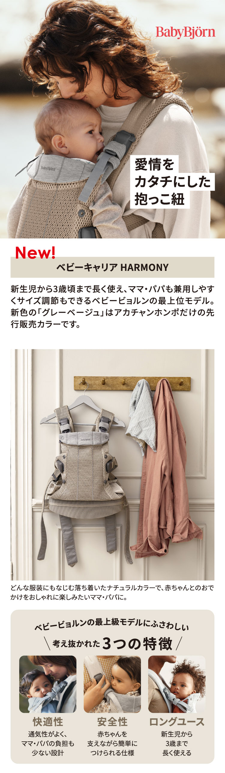 《Moments of Harmony》 ふわっと軽い 抱っこした瞬間に感じる赤ちゃんとの一体感 ベビービョルンの最新抱っこ紐HARMONY。通気性の良いフィット感のある生地に、 抱っこからおんぶまで、簡単に装着できるオールラウンドタイプ。 改良された厚いパッド入りのショルダーストラップにウエストベルト、 腰を楽にするエルゴノミックランバーサポートで優れた快適性をお届けします。 《日本人の体格を考慮したモデル》 ベビービョルンの抱っこ紐は、開発段階で日本人のパパママの声を反映しています。 ベルトのサイズを調整することで一緒にお使いいただけます。 《ソフトで伸縮性のある3Dメッシュ》 生地はフルメッシュで通気性が抜群。汗っかき赤ちゃんも安心です。 また、ソフトで伸縮性があるので赤ちゃんの体にぴったりフィットします。 《ヒップシートポジション》 ヒップシートポジションで赤ちゃんを適切な位置に保ちます。ショルダーベルトを 締めることで高い位置での抱っこが可能です。 《洗濯機で洗えます》 ネットに入れて洗濯機で洗えます。コットン素材よりも早く乾くため、お手入れも 簡単です※当社比。