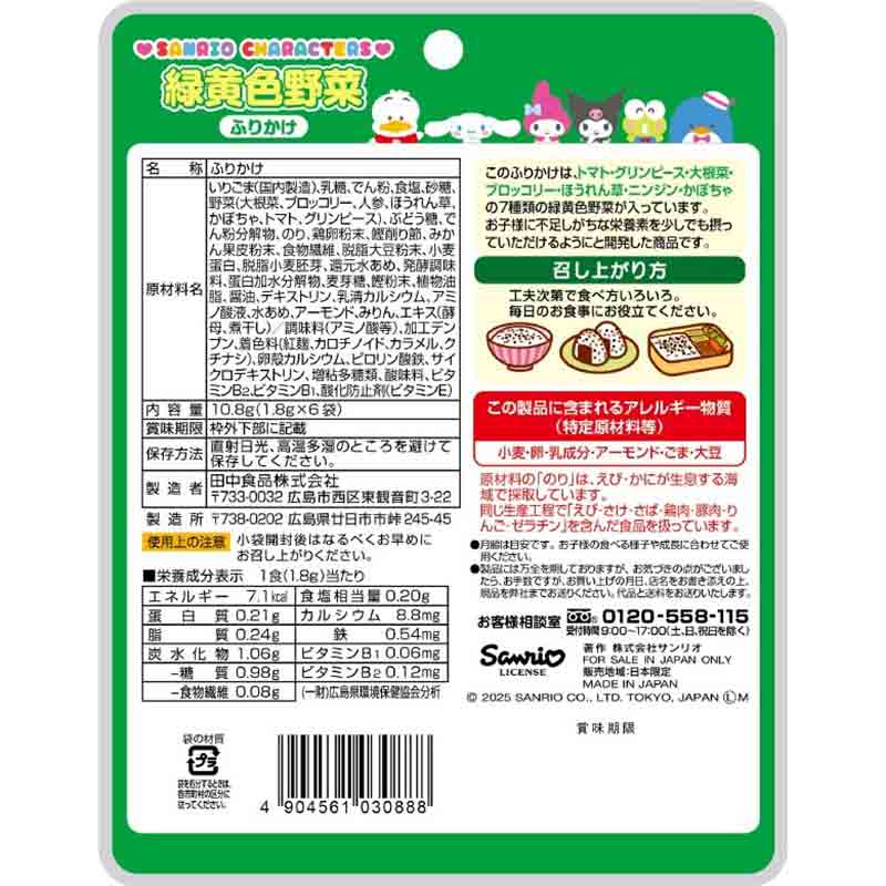 ●ふりかけ ●原材料名:いりごま(国内製造)、乳糖、でん粉、食塩、砂糖、野菜(大根菜、ブロッコリー、人参、ほうれん草、かぼちゃ、トマト、グリンピース)、ぶどう糖、でん粉分解物、のり、鶏卵粉末、鰹削り節、みかん果皮粉末、食物繊維、脱脂大豆粉末、小麦蛋白、脱脂小麦胚芽、還元水あめ、発酵調味料、蛋白加水分解物、麦芽糖、鰹粉末、植物油脂、醤油、デキストリン、乳清カルシウム、アミノ酸液、水あめ、アーモンド、みりん、エキス(酵母、煮干し)/調味料(アミノ酸等)、加工デンプン、着色料(紅麹、カロチノイド、カラメル、クチナシ)、卵殻カルシウム、ピロリン酸鉄、サイクロデキストリン、増粘多糖類、酸味料、ビタミンB2、ビタミンB1、酸化防止剤(ビタミンE) ●内容量:10.8g(1.8g×6袋) ●栄養成分:その他 熱量 7.1kcal たんぱく質 0.21g 脂質 0.24g 炭水化物 1.06g ナトリウム -mg 糖質 0.98g 食物繊維 0.08g カルシウム 8.8mg 鉄 0.54mg ビタミンB1 0.06mg ビタミンB2 0.12mg