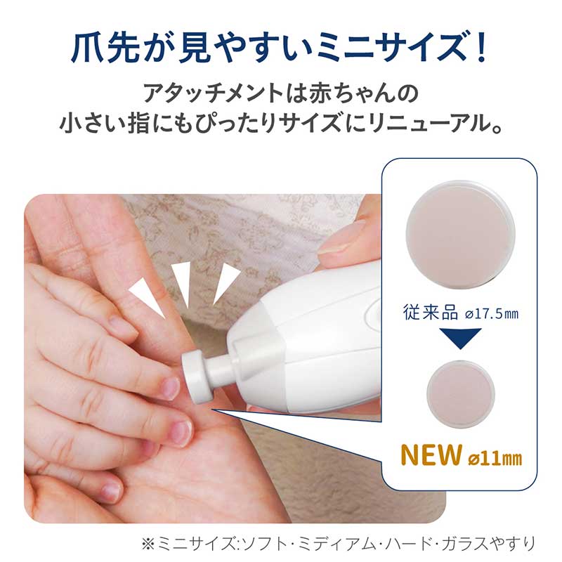 はじめてでも安 心&ラクラクな電動つめやすりから、爪先がよりなめらかに整うガラス製アタッチメント付きのプレミア ムモデルが登場。 赤ちゃん用のアタッチメントは、爪先が見やすいミニサイズにリニューアル。 一定の方向に動く『回転式』でやさしく削れ、スピード2段階、左右回転が選べます。 ガラス製の他に赤ちゃんの月齢に合わせた粗さの異なる3種類の紙やすりと、ママのネイルケアに使える3種類のアタッチメントが付いているから、目的に合わせた使い分けができます。
