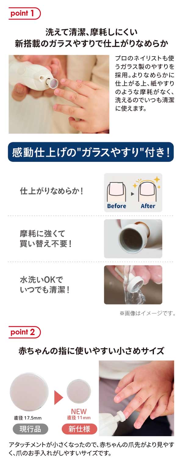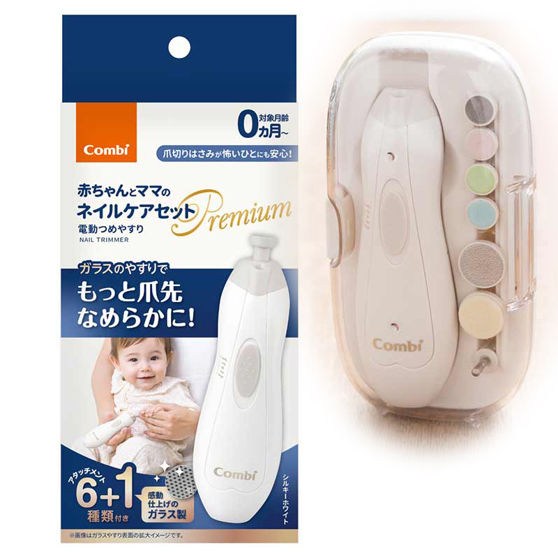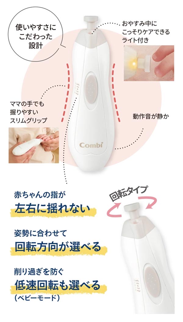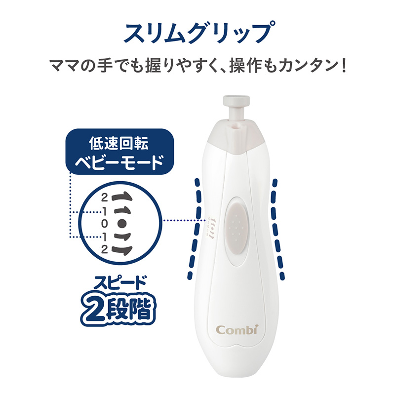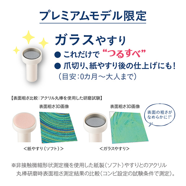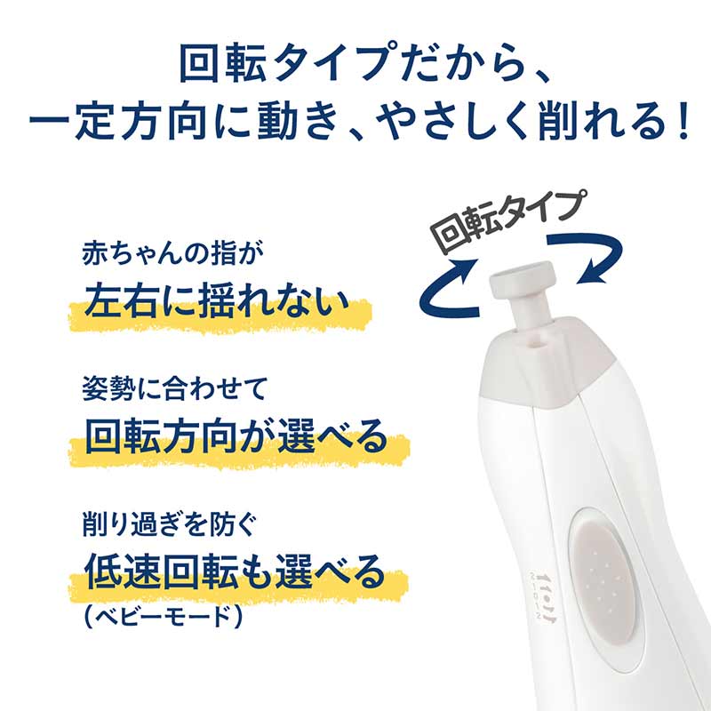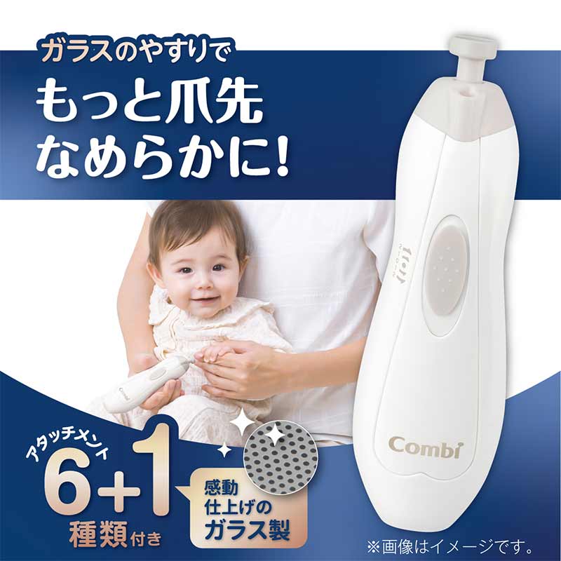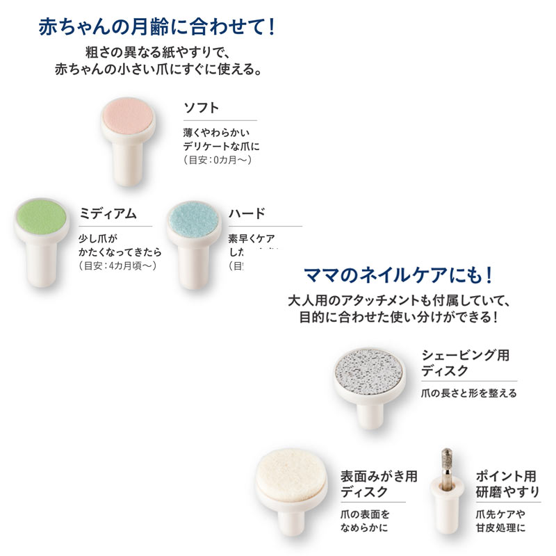 はじめてでも安 心&ラクラクな電動つめやすりから、爪先がよりなめらかに整うガラス製アタッチメント付きのプレミア ムモデルが登場。 赤ちゃん用のアタッチメントは、爪先が見やすいミニサイズにリニューアル。 一定の方向に動く『回転式』でやさしく削れ、スピード2段階、左右回転が選べます。 ガラス製の他に赤ちゃんの月齢に合わせた粗さの異なる3種類の紙やすりと、ママのネイルケアに使える3種類のアタッチメントが付いているから、目的に合わせた使い分けができます。