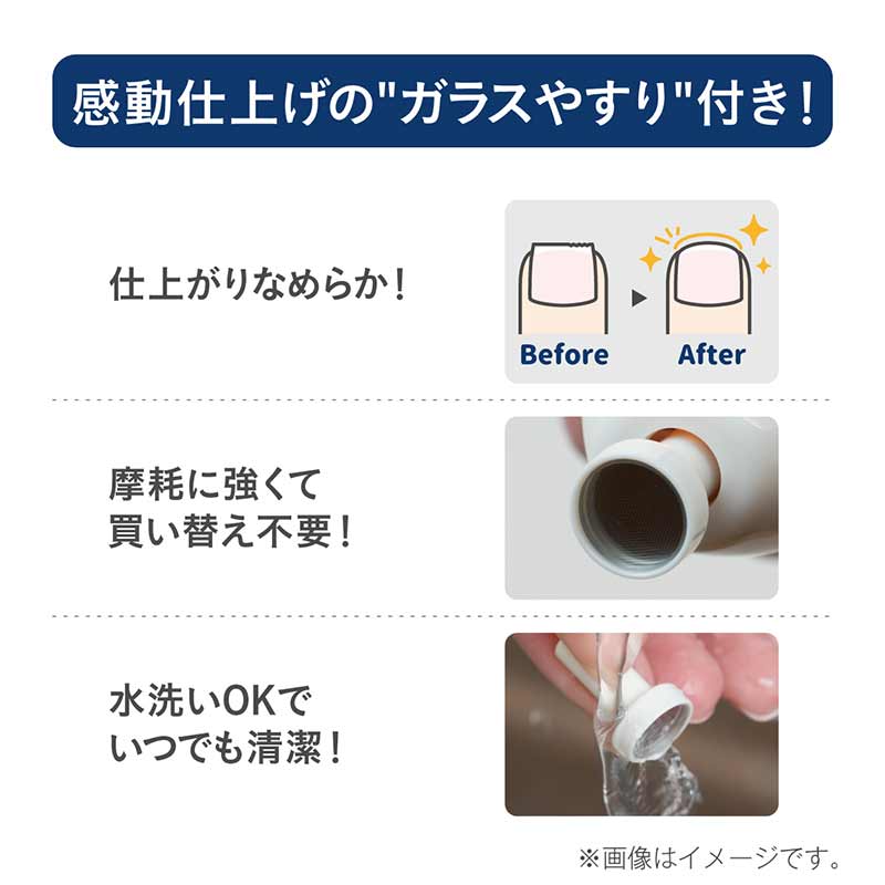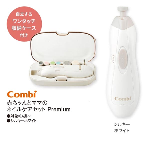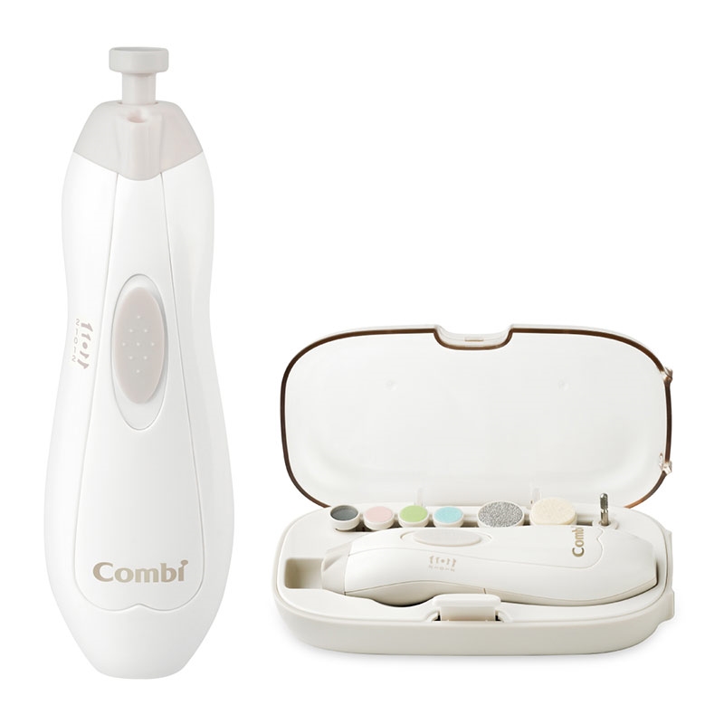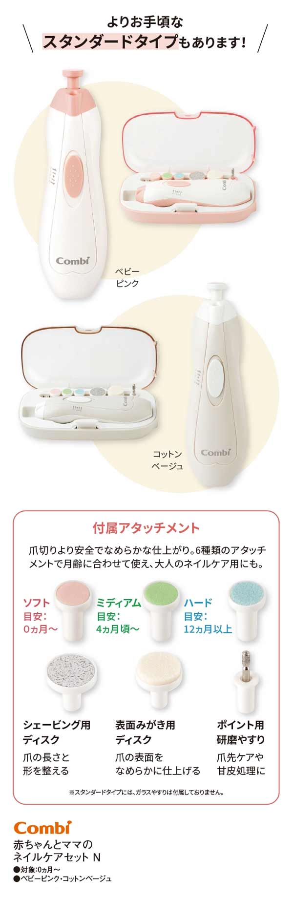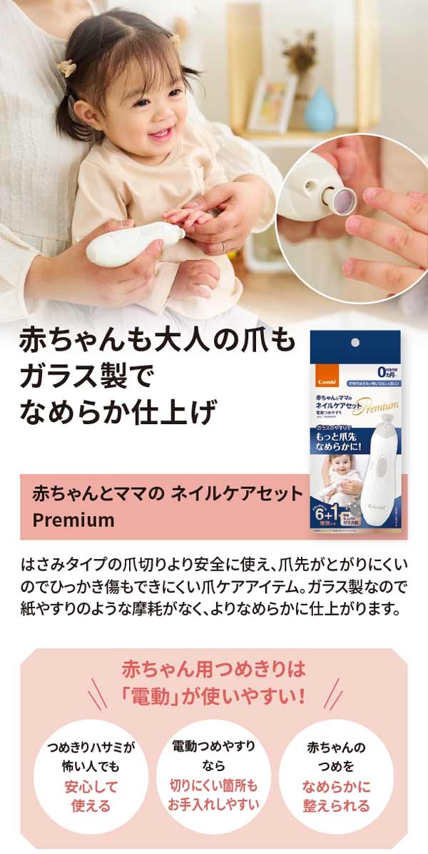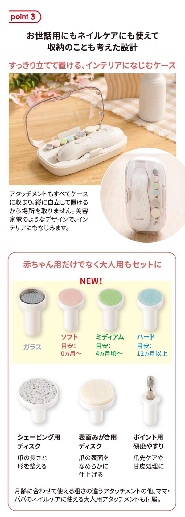 はじめてでも安 心&ラクラクな電動つめやすりから、爪先がよりなめらかに整うガラス製アタッチメント付きのプレミア ムモデルが登場。 赤ちゃん用のアタッチメントは、爪先が見やすいミニサイズにリニューアル。 一定の方向に動く『回転式』でやさしく削れ、スピード2段階、左右回転が選べます。 ガラス製の他に赤ちゃんの月齢に合わせた粗さの異なる3種類の紙やすりと、ママのネイルケアに使える3種類のアタッチメントが付いているから、目的に合わせた使い分けができます。