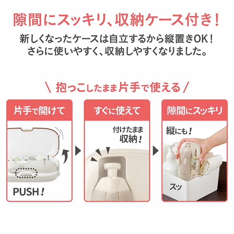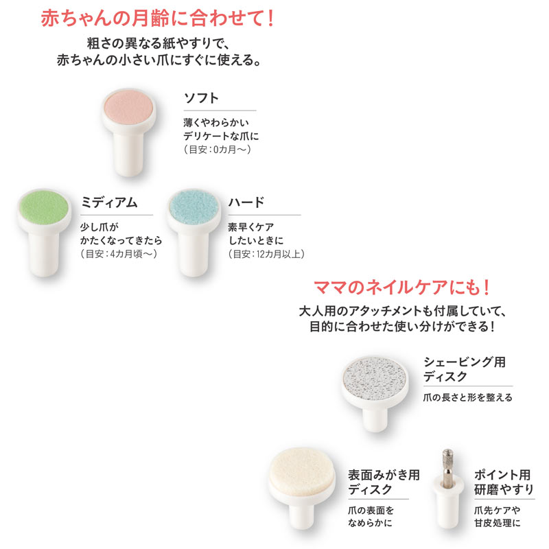 ●単3形アルカリ乾電池2本使用(別売) ●対象月齢:新生児~ ●アタッチメント6種付き:『紙やすり』 ソフト(0ヶ月~大人まで)、ミディアム(4ヶ月頃~大人まで)、ハード(12ヶ月頃~大人まで) 『大人用』 シェービング用、表面みがき用、ポイント用研磨やすり ●収納ケース付き ●主要素材 本体:アクリロニトリルブタジエンスチレン共重合体 ケース:アクリロニトリルブタジエンスチレン共重合体、ポリスチレン