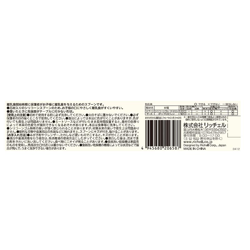 ●材質: スプーン:シリコーンゴム・ナイロン、 ケース:ポリプロピレン ●対象月齢:5ヵ月頃~ ●食洗機対応 ●耐熱温度:スプーン:120℃、ケース:90℃ ●スプーン本体・ケースともに ×煮沸・スチーム・電子レンジ消毒不可 〇薬液消毒可