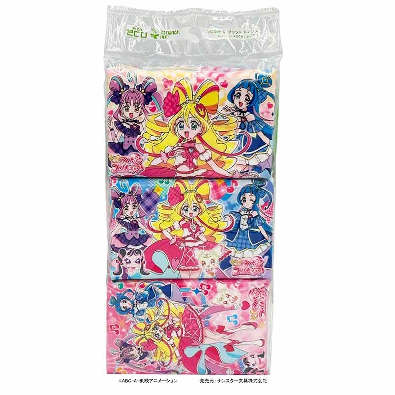 キミとアイドルプリキュアのポケットティッシュ。 個装パッケージは3柄アソートで6個パック。 お子様のお洋服のポケットに入れやすいミニサイズのポケットティッシュです。 中身のティッシュはパルプ100%でお肌に優しく、携帯に便利な水に流せるタイプ。 プリキュアのプリントも印刷されています。 (c)ABC-A・東映アニメーション