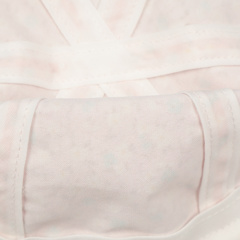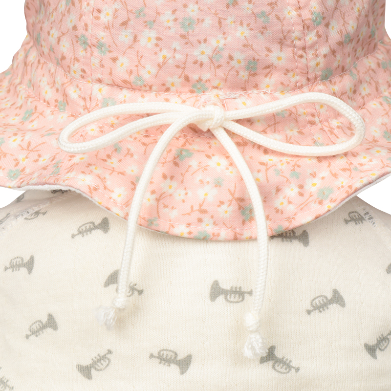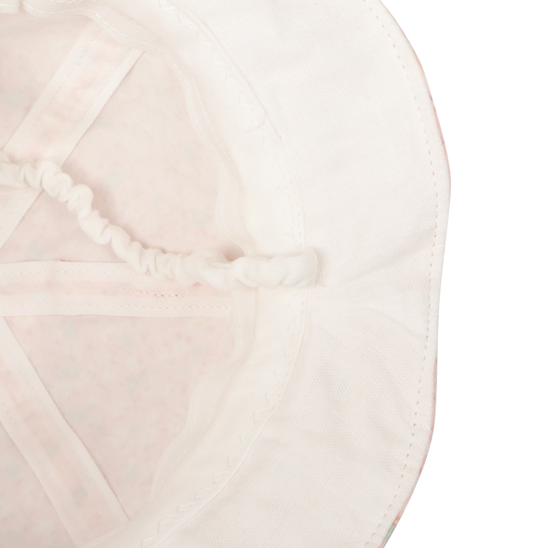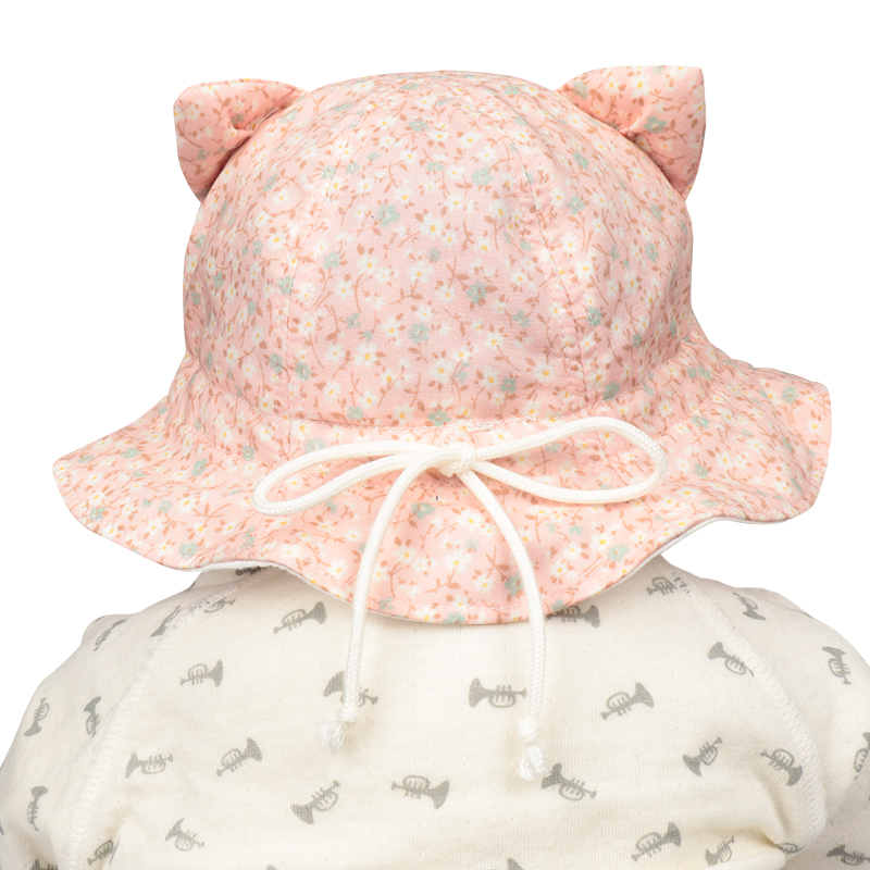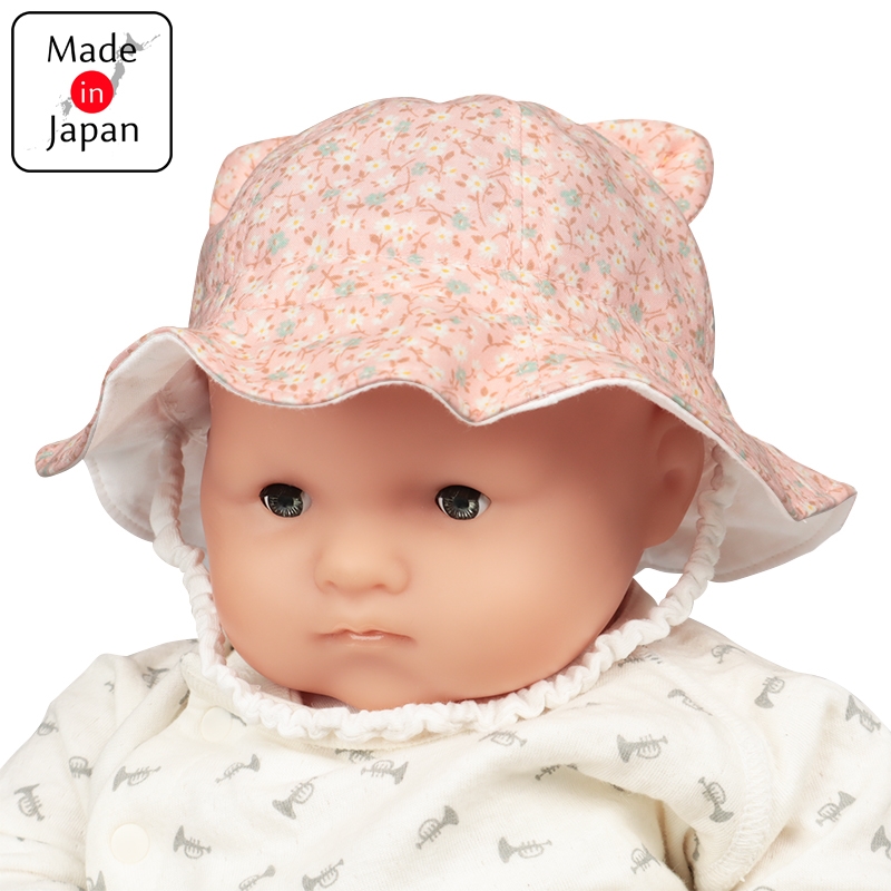 頭回りに丸ひもを通していて、リボンの長さを変える事で、成長に合わせて調節が可能です。 花柄はネコのお耳がついていて、無地にはくまのお耳がついています。 日差しが気になるお外では、紫外線対策としてもおすすめです。 あごゴムには、赤ちゃんの肌に優しい綿素材でゴムを包んだものを使用しています。