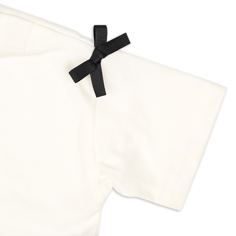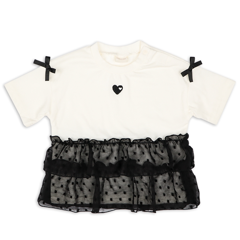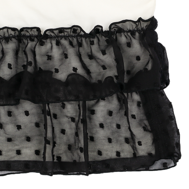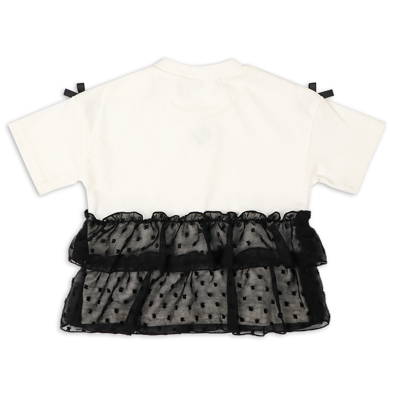 本体 綿60% ポリエステル40%、 シフォン部分 ポリエステル100、リブ部分 綿57% ポリエステル40% ポリウレタン3% サイズ(約-cm): 80サイズ 着丈34.0、身巾(バスト)30.0、肩巾33.0、袖丈8.5 90サイズ 着丈37.0、身巾(バスト)32.0、肩巾35.0、袖丈9.5 95サイズ 着丈38.5、身巾(バスト)33.0、肩巾36.0、袖丈10.0