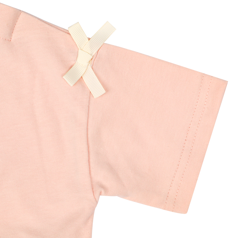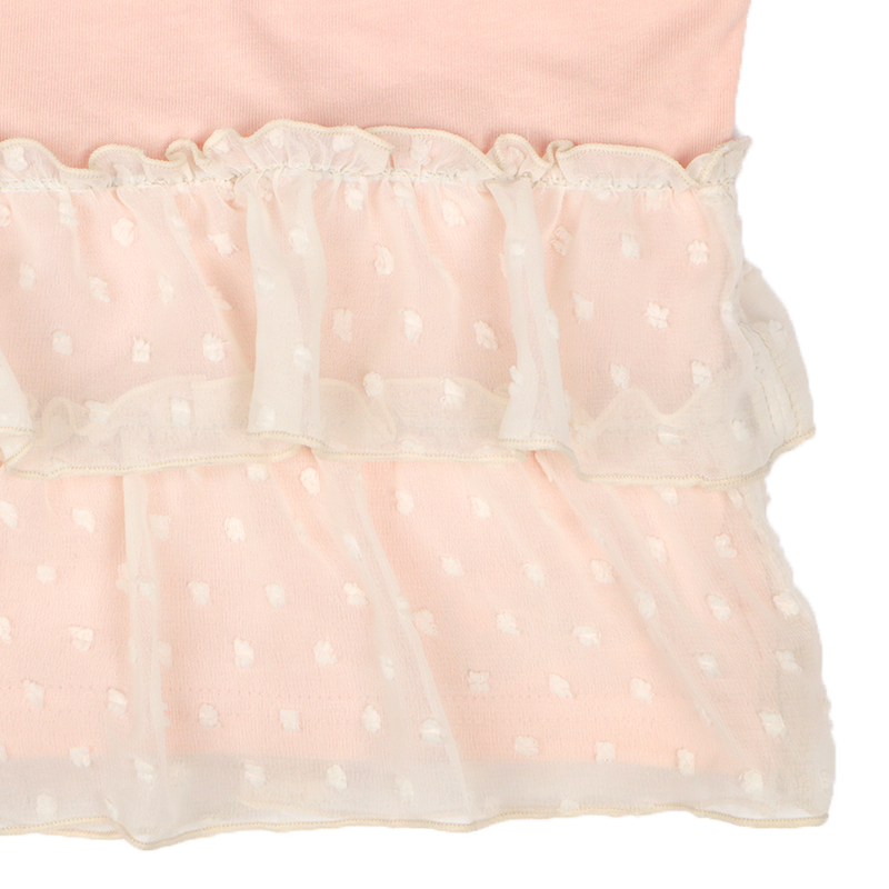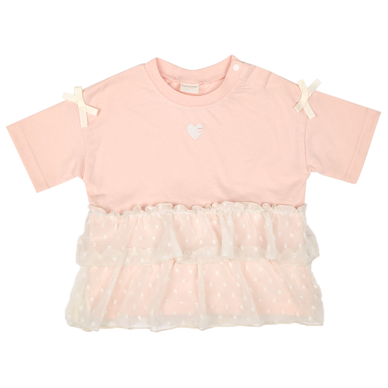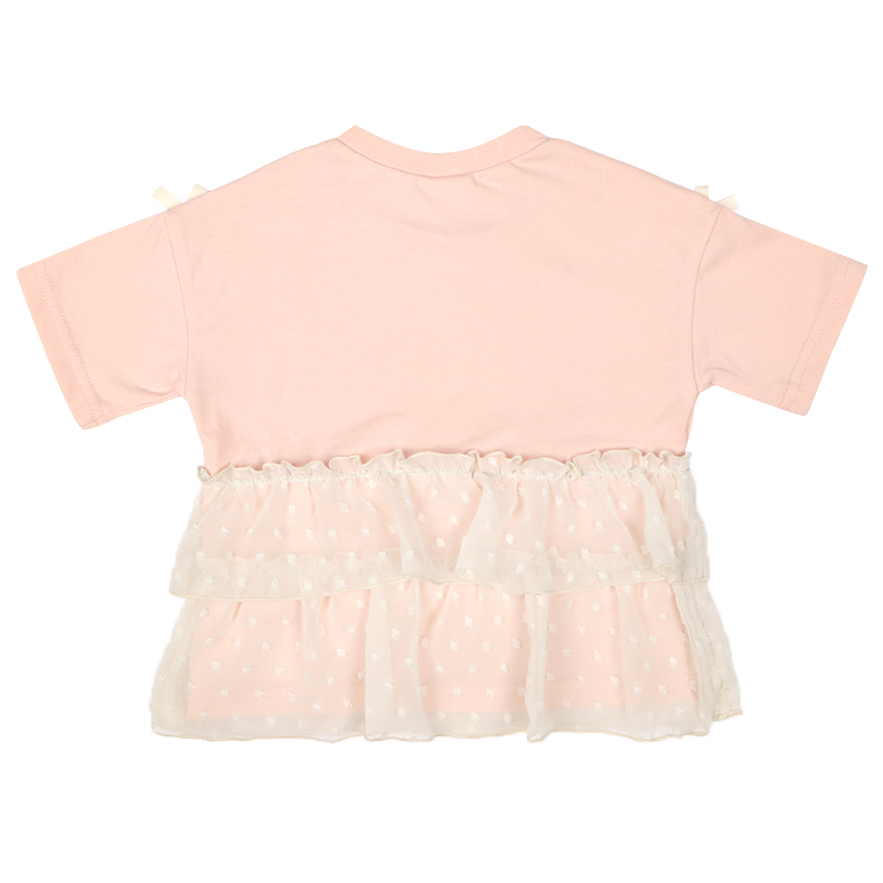 本体 綿60% ポリエステル40%、 シフォン部分 ポリエステル100、リブ部分 綿57% ポリエステル40% ポリウレタン3% サイズ(約-cm): 80サイズ 着丈34.0、身巾(バスト)30.0、肩巾33.0、袖丈8.5 90サイズ 着丈37.0、身巾(バスト)32.0、肩巾35.0、袖丈9.5 95サイズ 着丈38.5、身巾(バスト)33.0、肩巾36.0、袖丈10.0