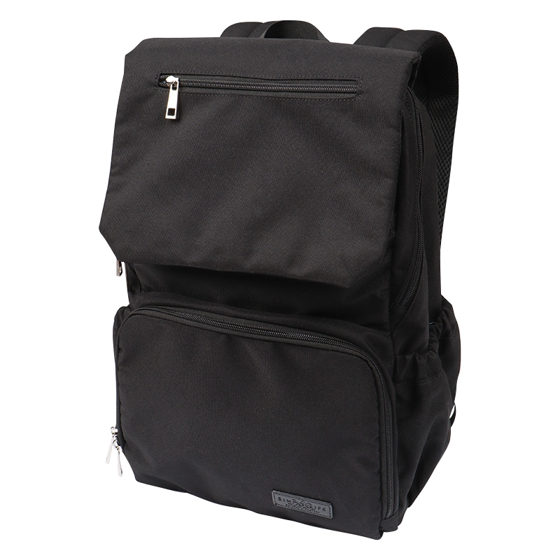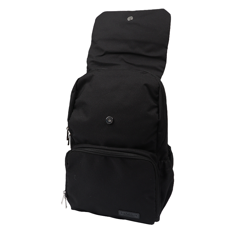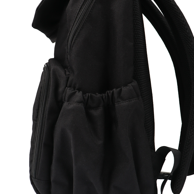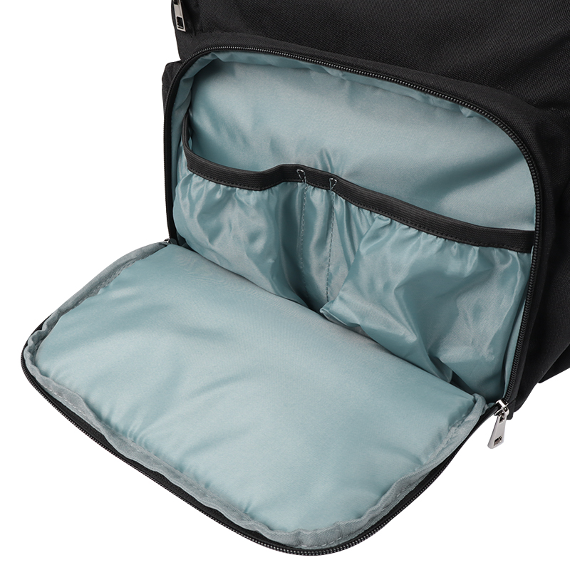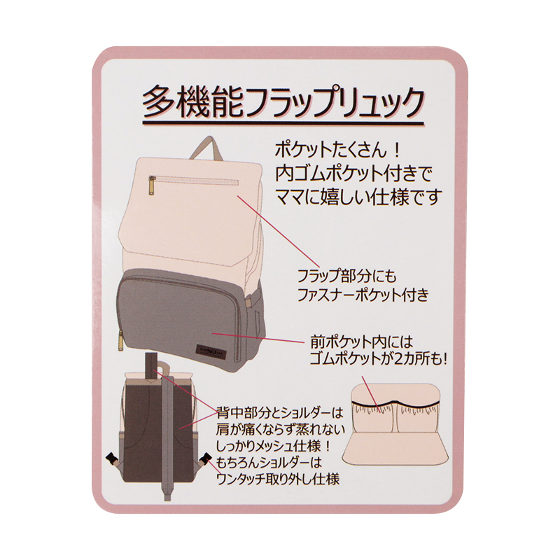 ポケットを全10か所。内ゴムポケット6か所仕様でママに嬉しい仕様です。フラップ部分もファスナーポケットが付き右側サイドにはティッシュ用の取り出し口もついています。内ポケット内にはゴムポケットが2か所とフリーポケットも装備しており大容量のリュックです。背中部分とショルダーは肩が痛くならず蒸れない しっかりメッシュを使用しています。もちろんショルダーはワンタッチで取り外し可能な仕様となっています。